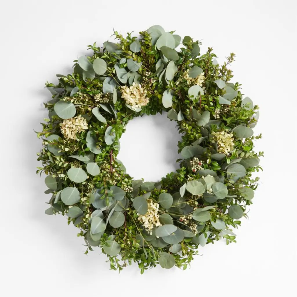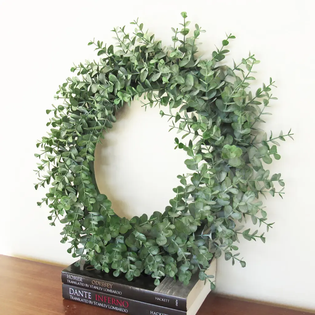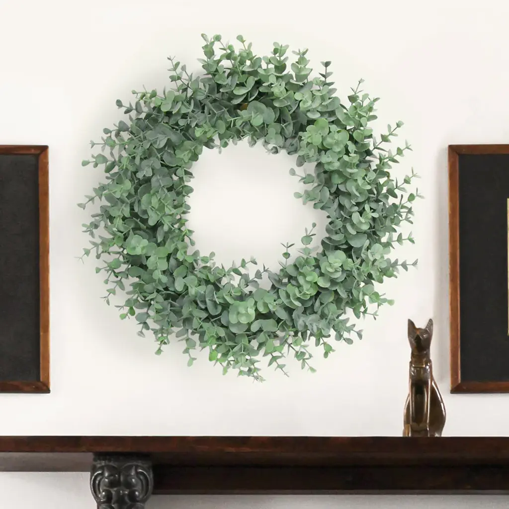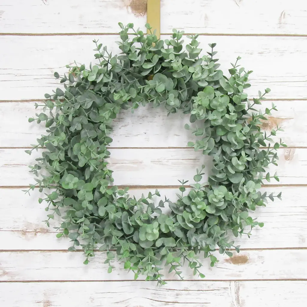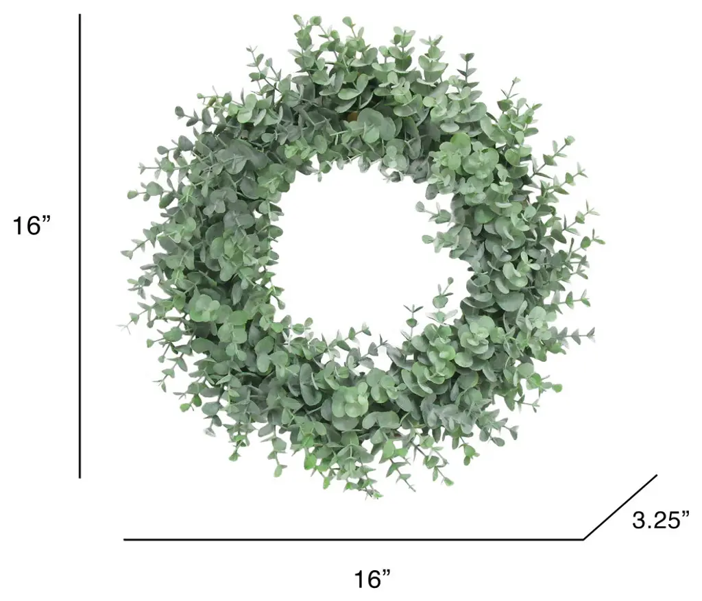 This natural-look artificial rustic eucalyptus wreath is popular for its frosted color and gorgeous ring of greens. Exhibits a simple and subtle look with versatile use. Easy to incorporate into any home, office, or event setting for a touch of greenery. Display as a hanging wreath, tabletop centerpiece, candle ring, and more! Forever fresh, no hassle.Features:• 16" L x 16" W x 3.25" DP• Frosted eucalyptus foliage on sturdy plastic ring backing • Hanging or tabletop use • Best for indoor or covered outdoor usage • Product may ship compressed. Primping of branches or leaves may be required to match the image shown. Images represent actual product, but please understand color may vary slightly due to differences in computer monitor color displays, photographic lighting, or image enhancement.