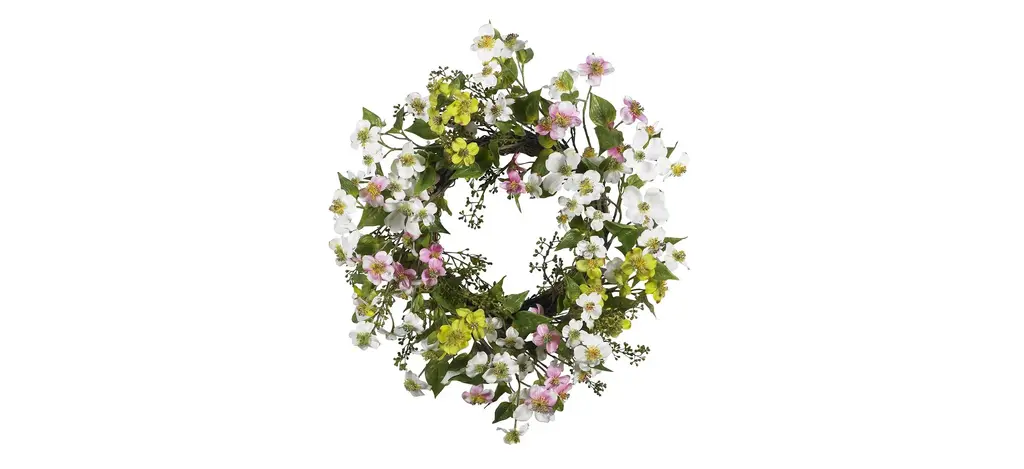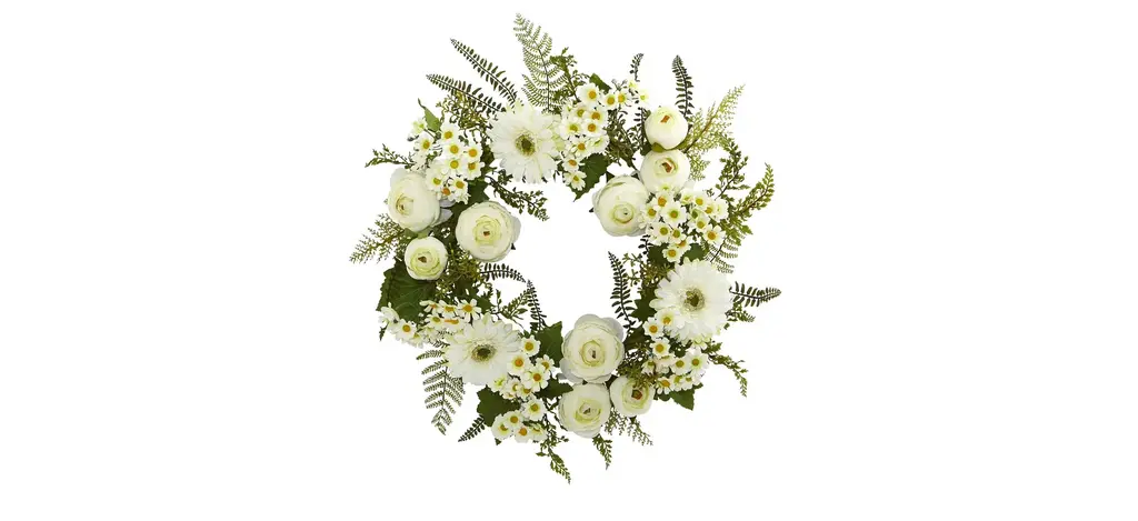 The green ferns and leaves of the 24" gold trimmed hydrangea and berry artificial wreath cushions the intricately designed white blooms. With small pine cones and frosted berries, this is an excellent piece to add to your winter wonderland.