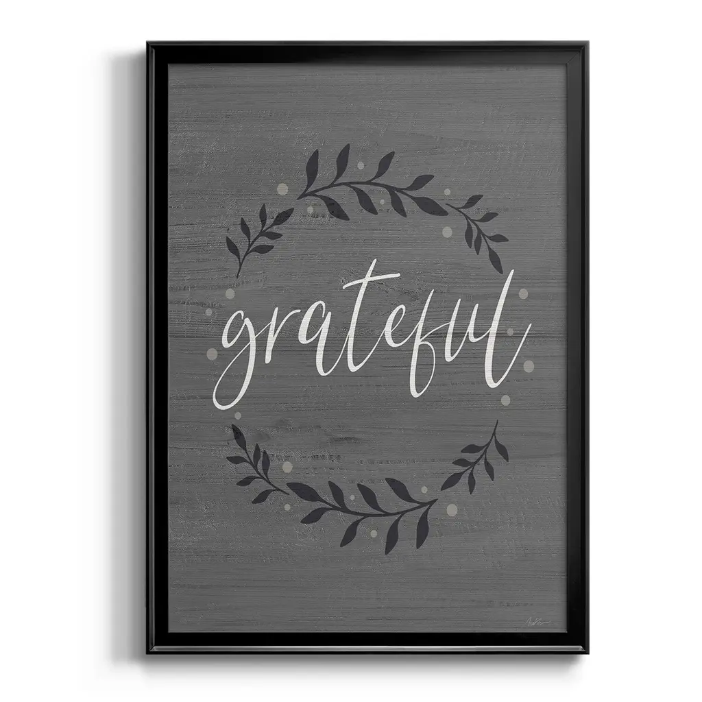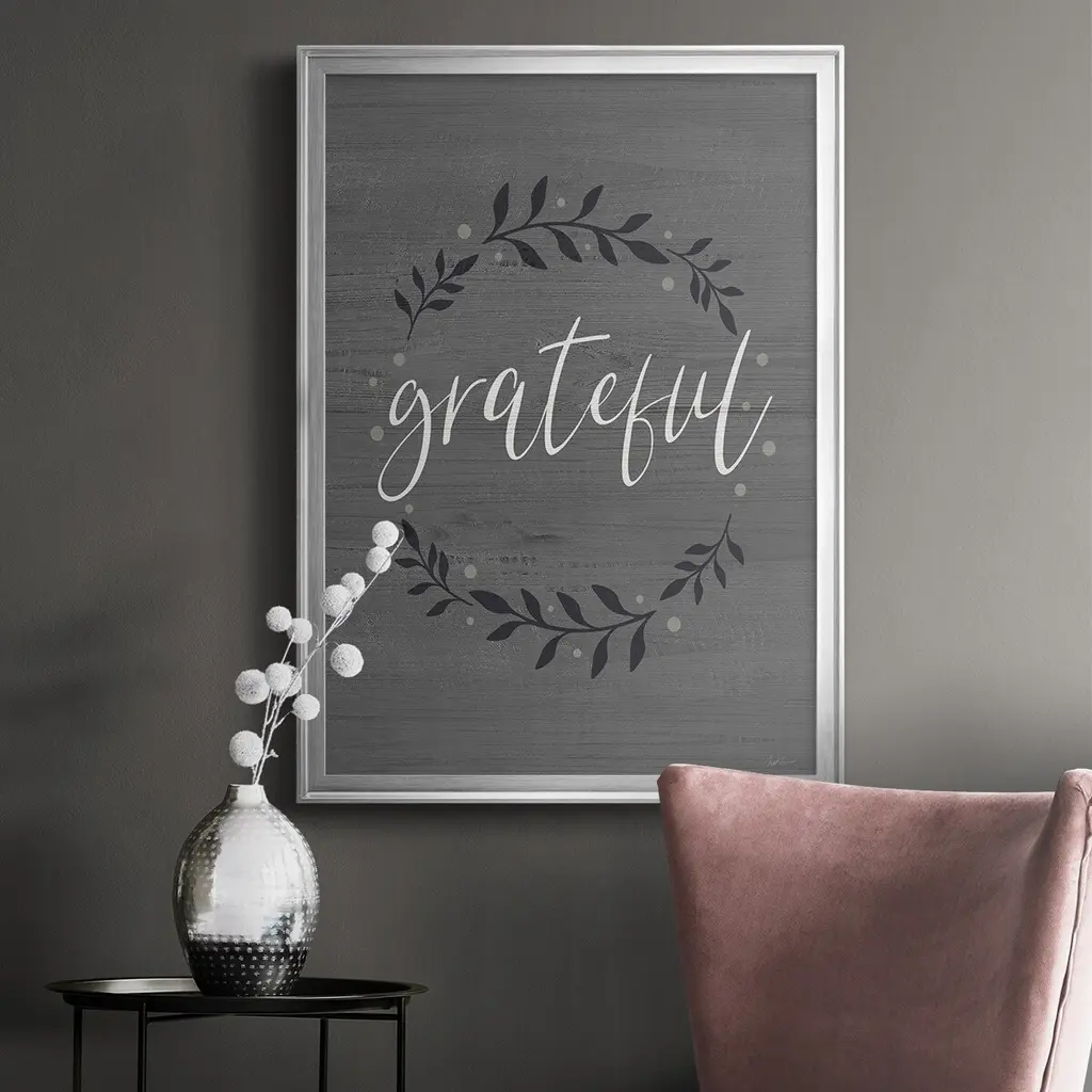 Grateful Wreath Premium Framed Print - Ready to Hang A Premium Framed Print created to last. Framed in distressed wood and available in an array of sizes and colors Featuring a beveled a solid wood stretcher bar, each piece comes ready to hand 4 SIZES AVAILABLE 30.5''X42.5'' - Overall Size 26.5'X36.5'' - Overall Size 22.5''x30.5'' - Overall Size 18.5''x24.5'' - Overall Size Each piece is made to order. Each piece comes with hanging hardware. Made in the USA Ready to Hang