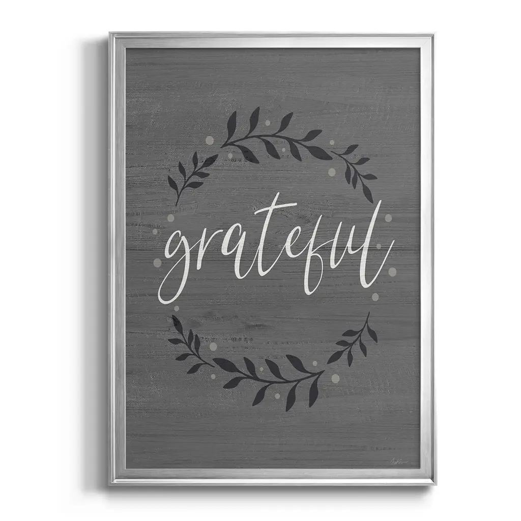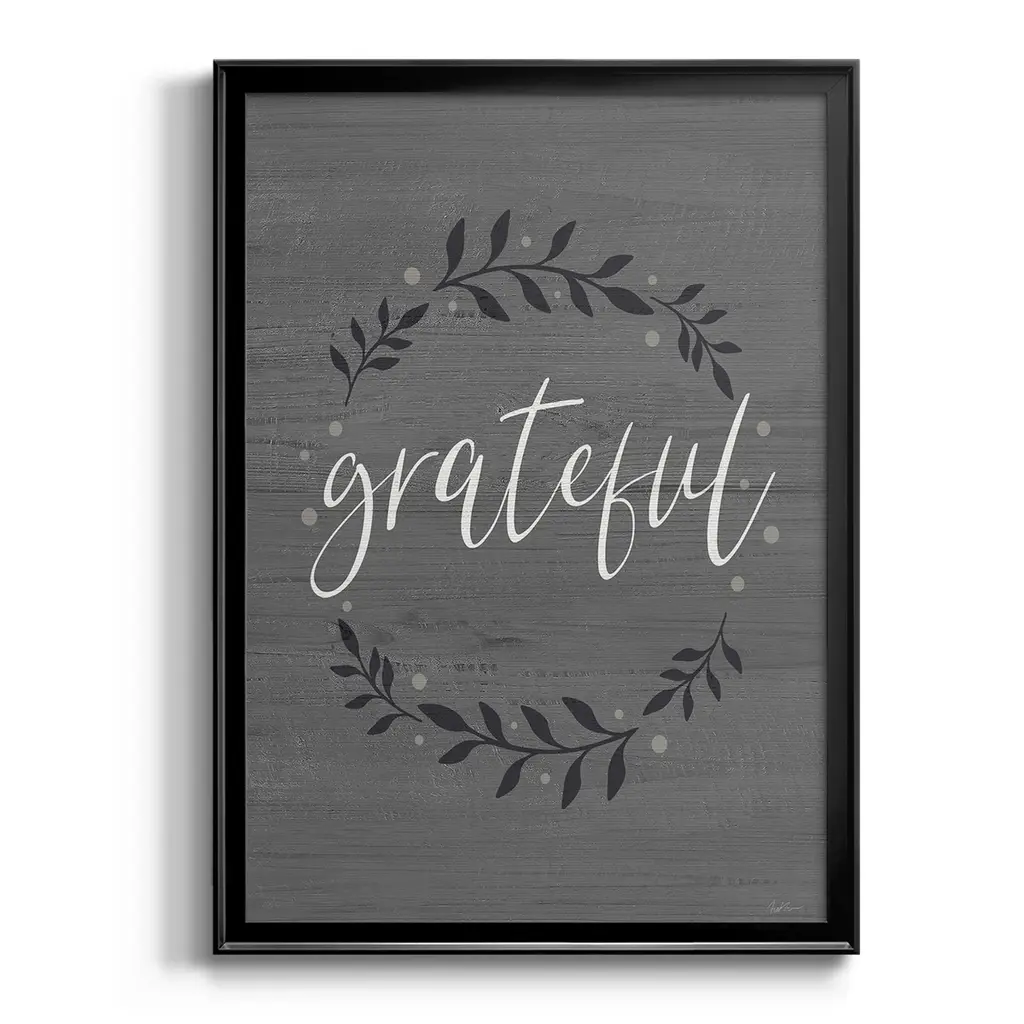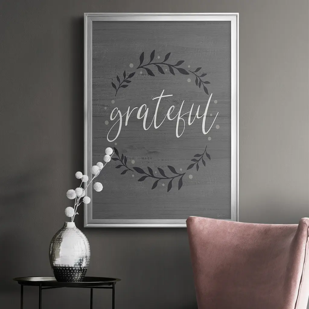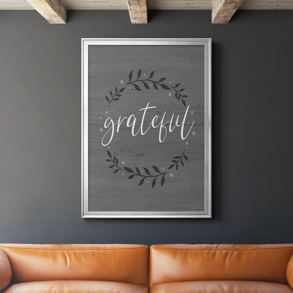 Grateful Wreath Premium Framed Print - Ready to Hang A Premium Framed Print created to last. Framed in distressed wood and available in an array of sizes and colors Featuring a beveled a solid wood stretcher bar, each piece comes ready to hand 4 SIZES AVAILABLE 30.5''X42.5'' - Overall Size 26.5'X36.5'' - Overall Size 22.5''x30.5'' - Overall Size 18.5''x24.5'' - Overall Size Each piece is made to order. Each piece comes with hanging hardware. Made in the USA Ready to Hang