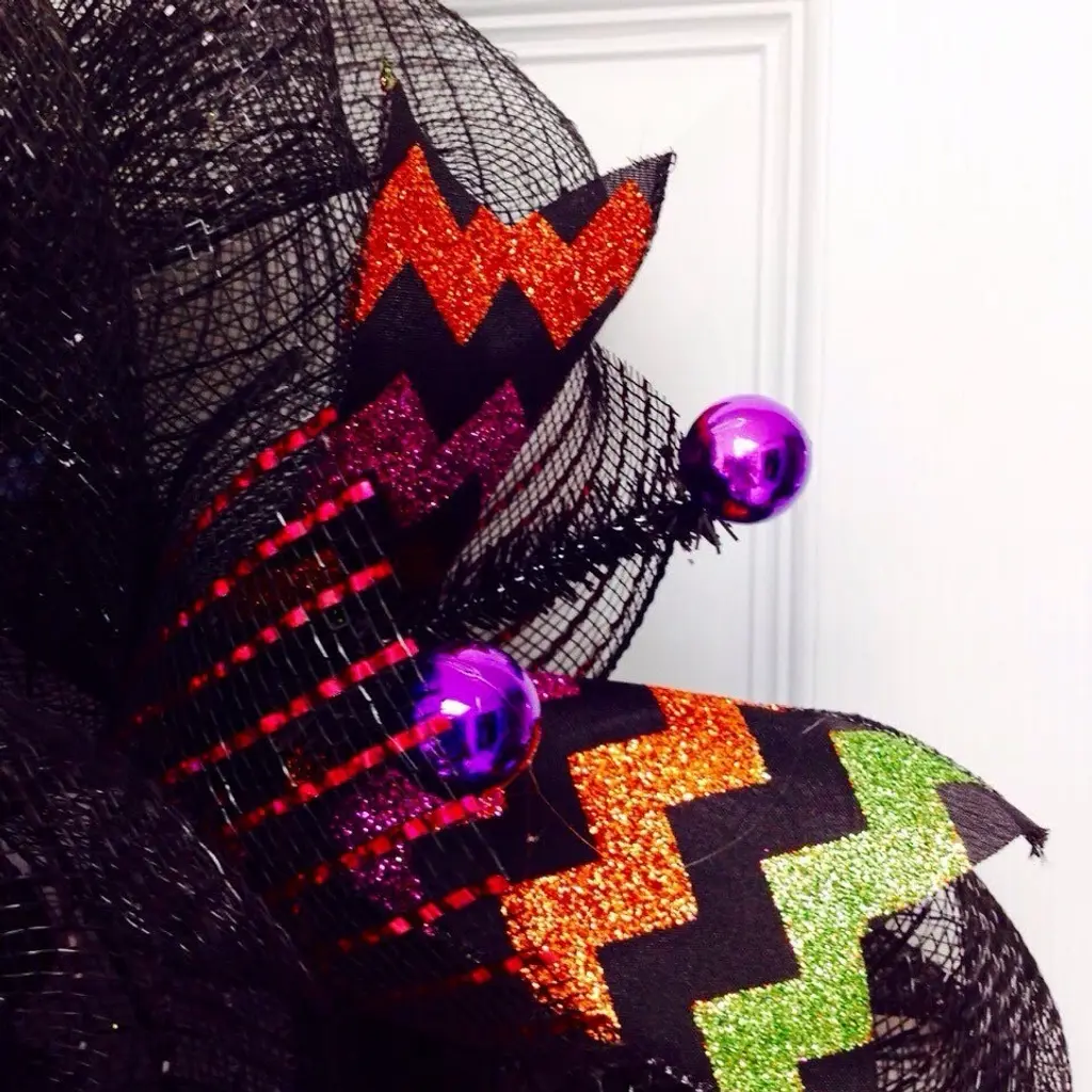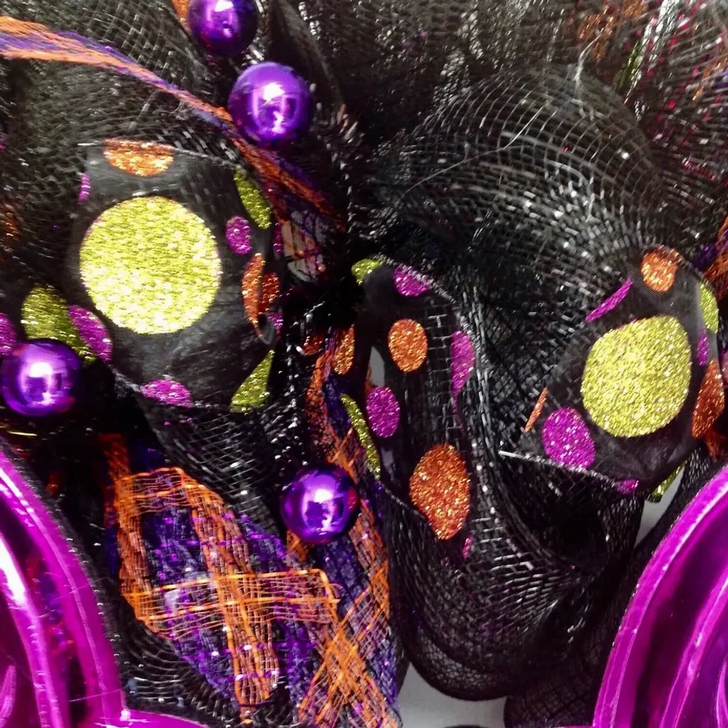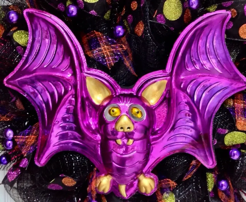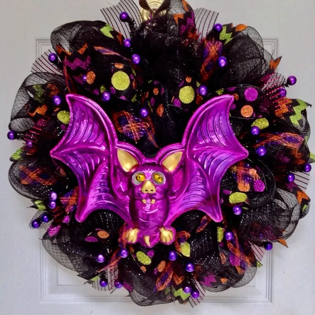 New! Full! Premium Handmade Deco Mesh Halloween Wreath made of durable, shimmering Deco Mesh. A large, shiny, purple Halloween bat, with bobble eyes which move, rests on a bed of shimming, metallic black deco mesh. The wreath has adorable loose metallic purple balls placed all around. The bat has bright gold claws, ears and nose.The inner ring has purple, orange and black flex mesh curls and black sheer ribbons with colored glitter dot ribbons. The outer ring has glistening black, purple and orange chevron glitter ribbons and black mesh bows with purple metallic lines. Great Halloween decoration for doors, windows or walls. The size is 24 inch diameter and 6 inches "¨