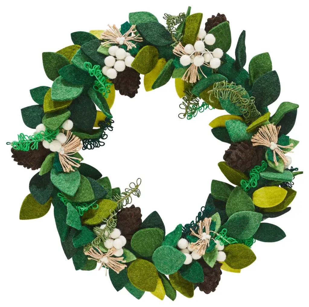 Green hand-felted wool leaves and berries decorate this beautiful hand-felted wool wreath. Wonderful in any season. For indoor use.Artisan made. 20" diameter. Bamboo core.