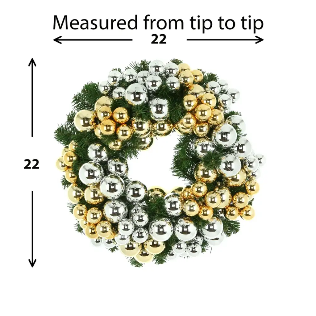 Give your home a festive feel with this beautiful, handmade artificial holiday wreath. Expertly crafted, this delightful creation is sure to impress. A lush evergreen wreath is decorated with a mix of silver and gold shatter-proof ornaments. Its classic color combination is the perfect addition to your seasonal decor. Requiring no maintenance, this stunning wreath can be enjoyed worry-free year after year.