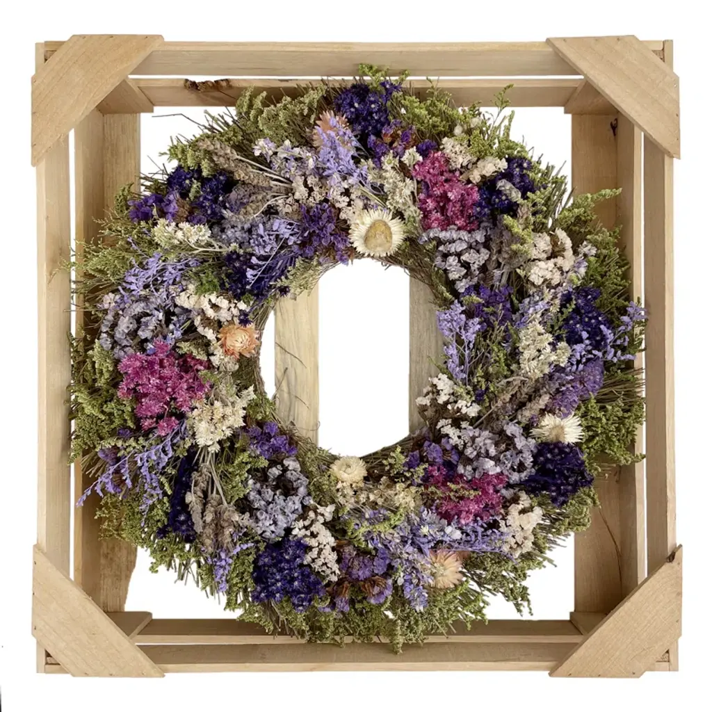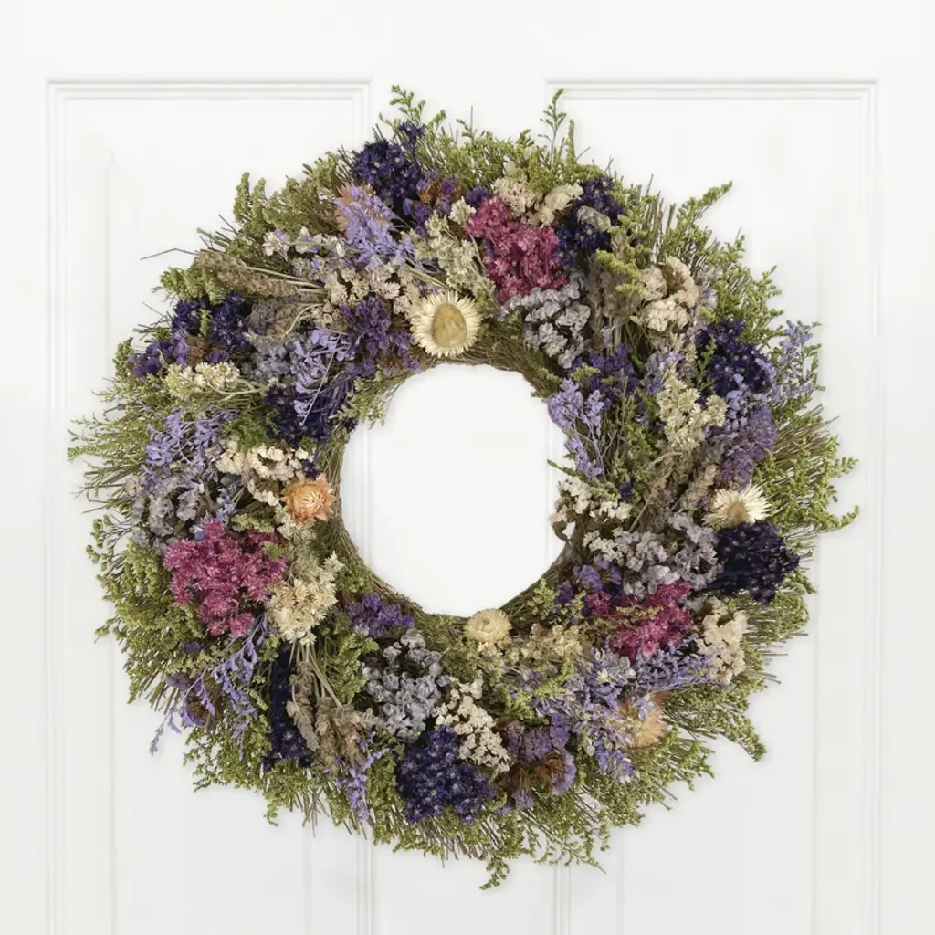 Using natural strawflowers, grains, and multiple types of delicate dried flowers, we hand made this delightful and elegant Strawflower Floral Wreath that fits perfectly with any decor.
