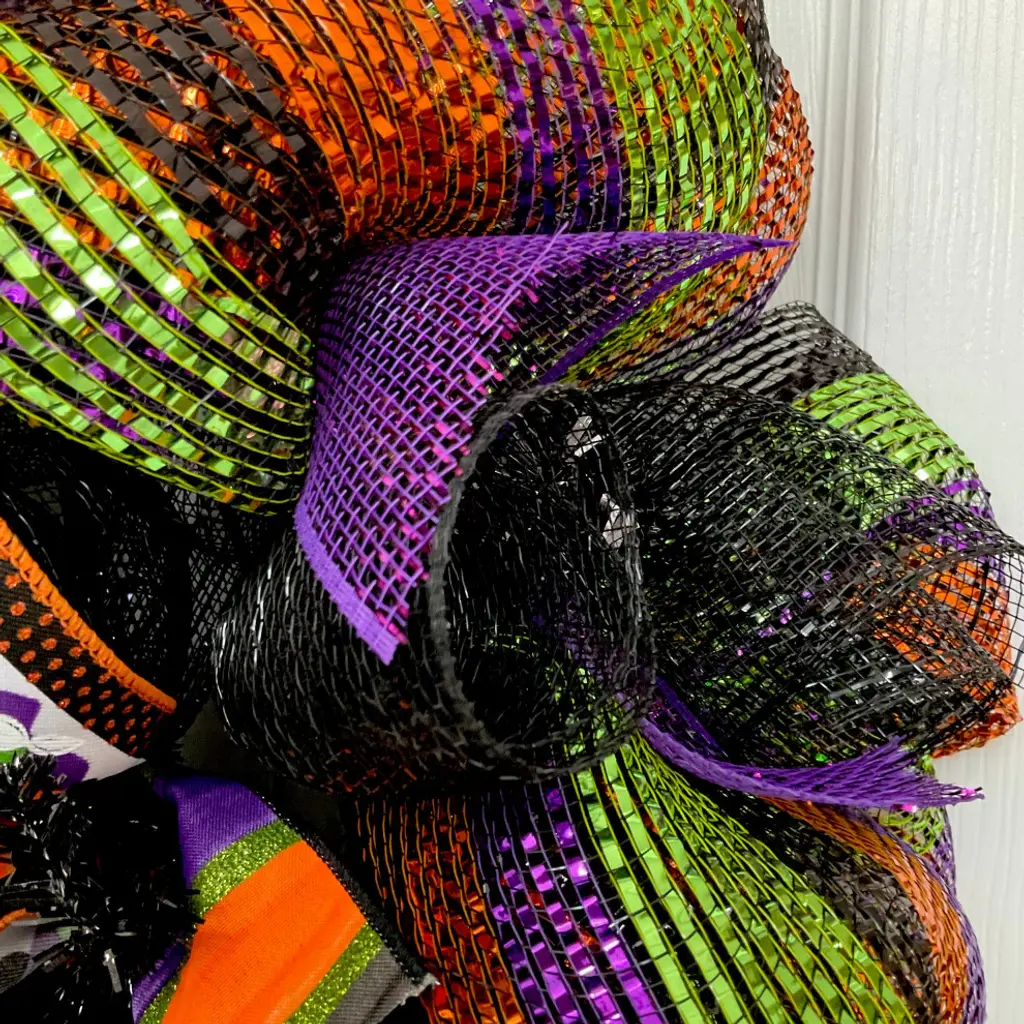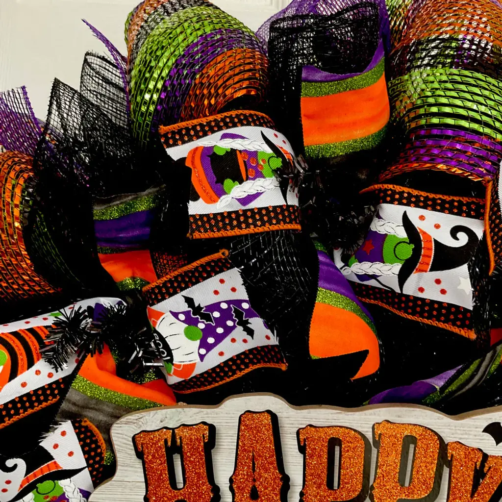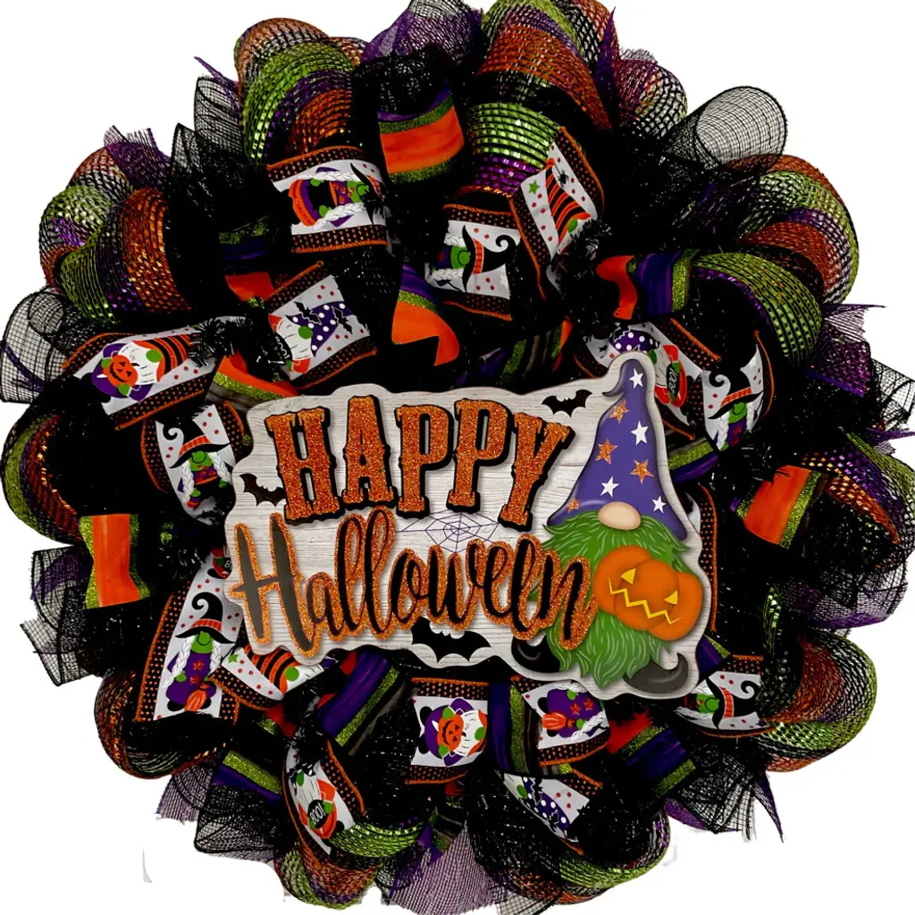 Full! Premium Handmade Deco Mesh Halloween Wreath! The outer ring is made deco mesh with metallic black, purple and orange tinsel stripes. Gorgeous metallic purple mesh bows and black metallic flutes are placed along the exterior. The inner ring is made of metallic black deco mesh and has premium Halloween striped ribbons and adorable Halloween Gnome ribbons around the center. The center of the wreath features a glittering, colorful, wood Happy Halloween sign featuring a gnome dressed as a wizard. Great Halloween decoration for doors, windows or walls. Beautiful glittering Halloween colors! The size is 24 inch diameter and 6 inches deep.