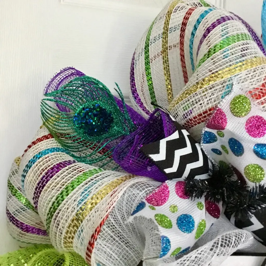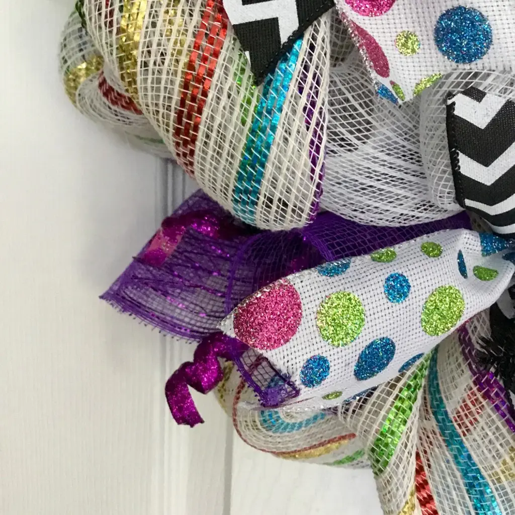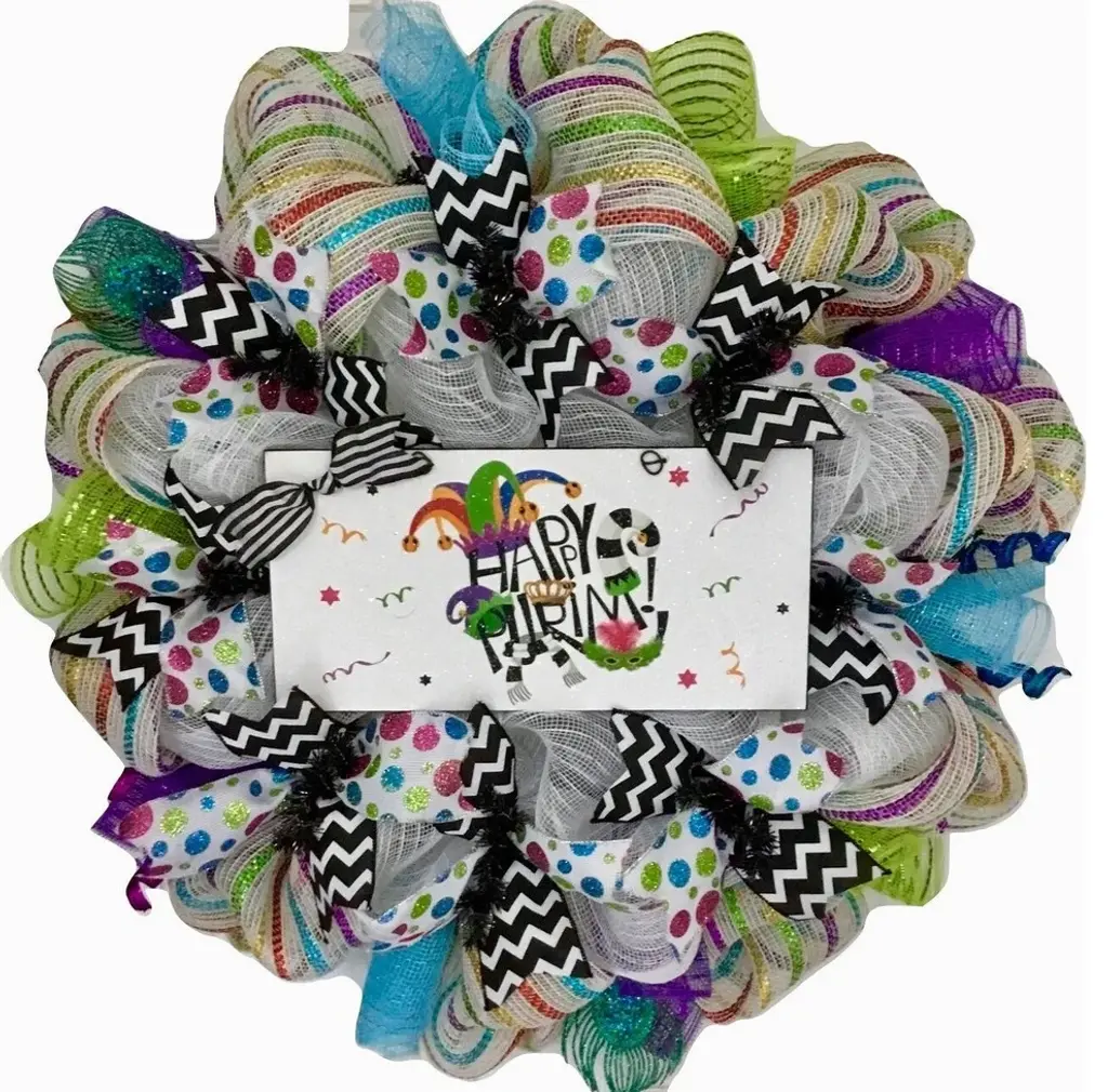 Beautiful, Festive, Handmade, Deco Mesh Purim Wreath. A large, handmade, white wood sign with the wording "œHappy Purim"� rests on a bed of pure white deco mesh. The sign is richly decorated with jester masks and festive decorations. A black and white bow rests on top of the sign. The inner ring has premium white ribbons with colorful, glittering dots and black and white chevron ribbon. The outer ring is made of white deco mesh with colorful metallic stripes. Bright green, purple and blue flutes surround the exterior. Party accents are placed along the outer ring. This wreath is perfect for celebrating Purim and is also available without the sign for birthday, New Years or masquerade parties.Size is 24 inch diameter and 6 inches deep.