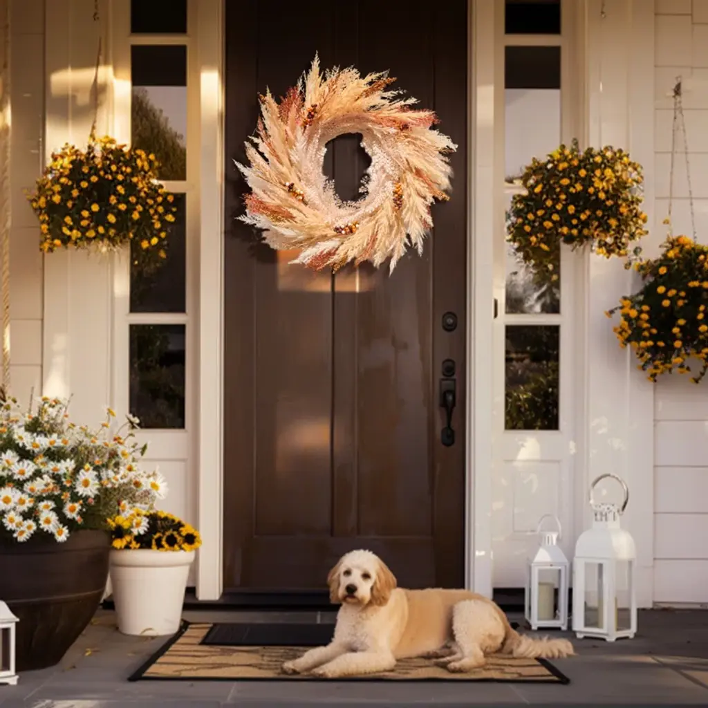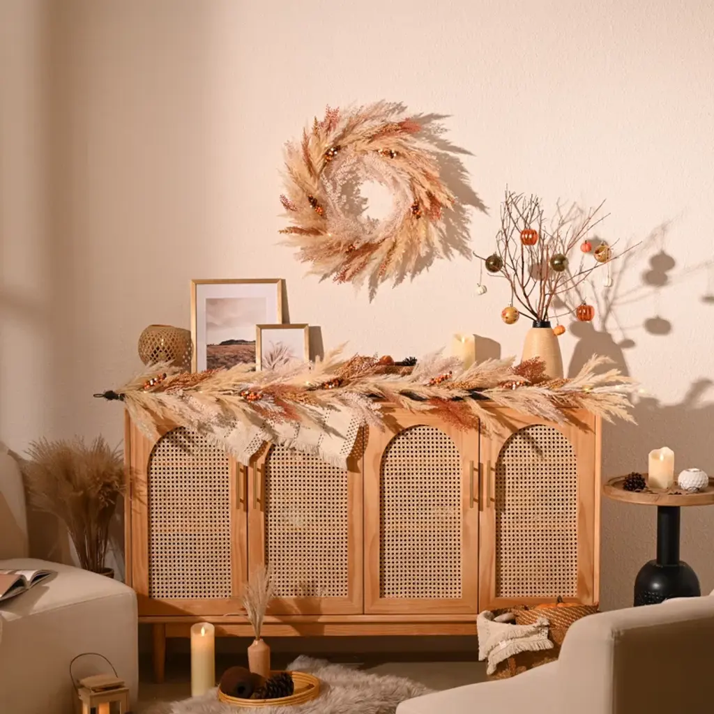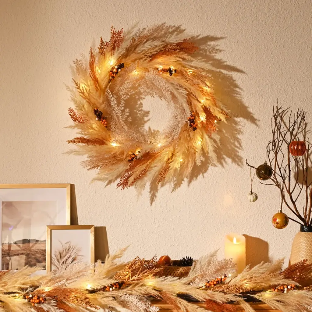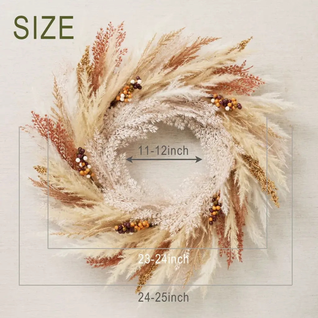 This decorative wreath features cattail,berries and other plants that are especially beautiful in the fall!Its design is suitable for both indoor and outdoor use. Hang it above your fireplace, place it on your front door, or on a living room wall. Give your door or dining table an eye-catching upgrade with this wreath. Perfect for fall, it offers a harvest of twigs and warm-hued blooms for an autumn-inspired appearance sure to stand out in any ensemble.