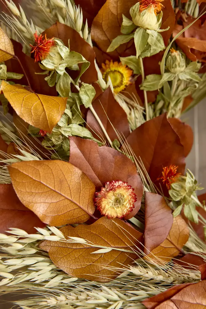 Handmade especially for terrain with botanicals grown and harvested on a woman-owned farm in the Pacific Northwest, this long-lasting wreath brings home the textures of harvest fields with green wheat, avena oats, strawflowers, and more.