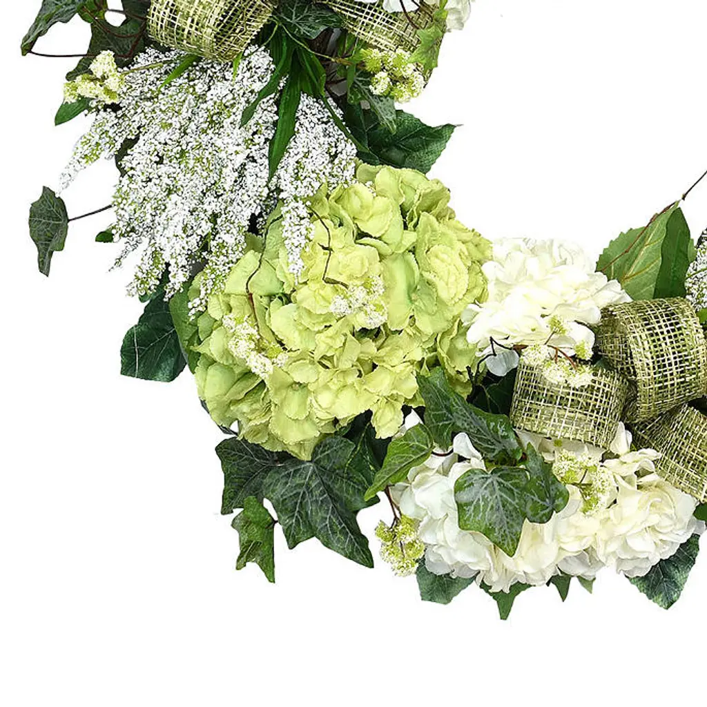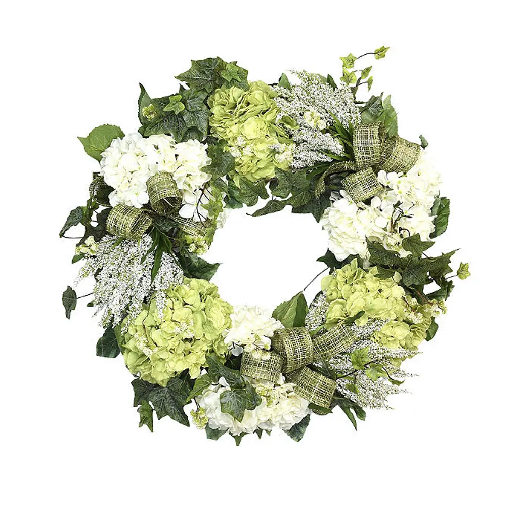 Lush, bursting blooms of heather, hydrangeas and ivy let you bring beautiful flora into your home. This lifelike wreath features a verdant arrangement of whites and greens. Lifelike polyester and plastic flowers and greenery Handcrafted Fluff and reshape after unpacking For indoor or covered outdoor use Gently wipe clean with a soft, dry cloth Made in USA A Frontgate exclusive. At Frontgate, our primary focus is quality. We guarantee that every product we sell will stand up to the supreme test – our customers' satisfaction. To learn more about our policies, visit our Shipping & Processing, Returns & Exchanges and Warranty & Price Guarantee pages.