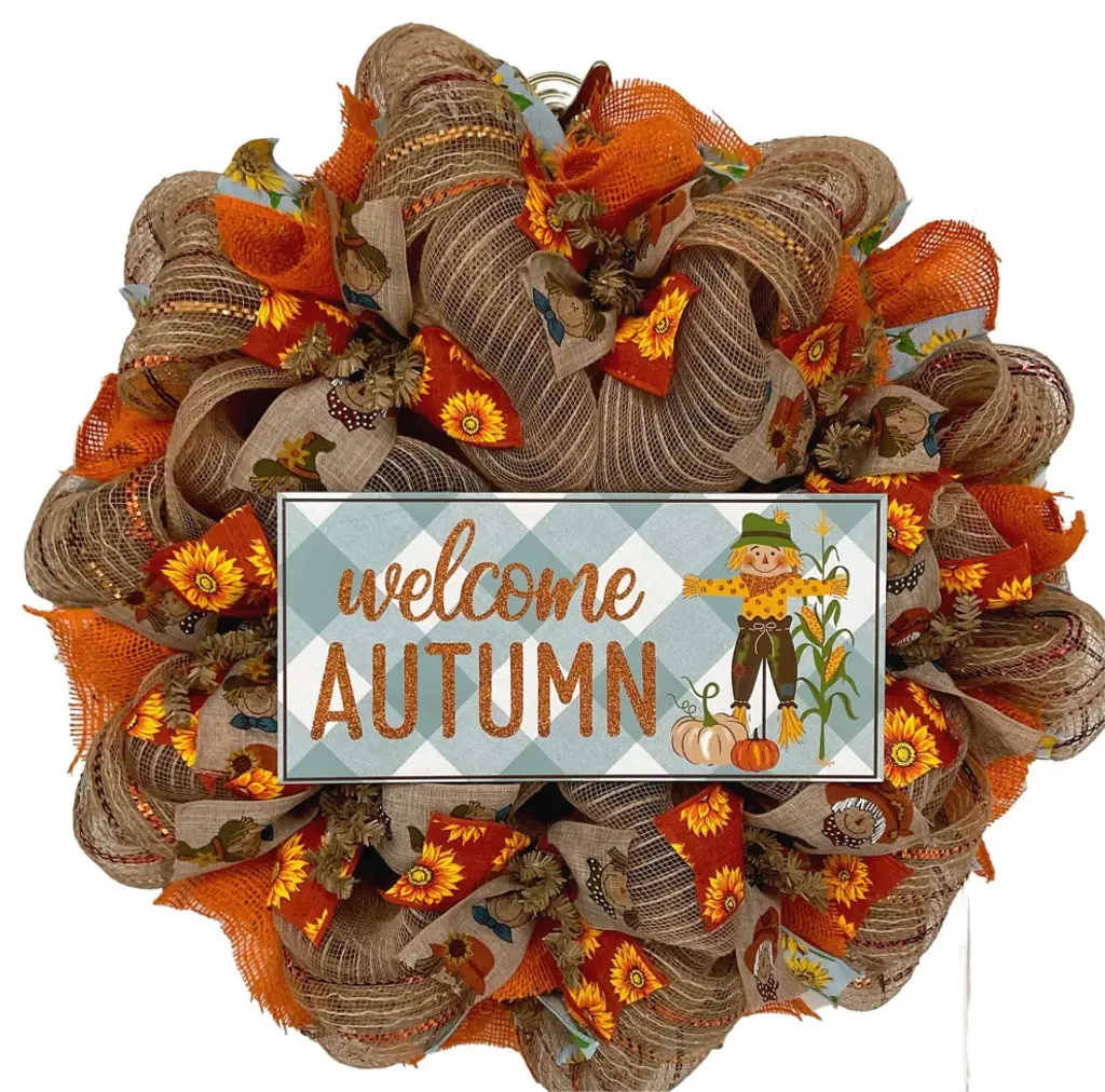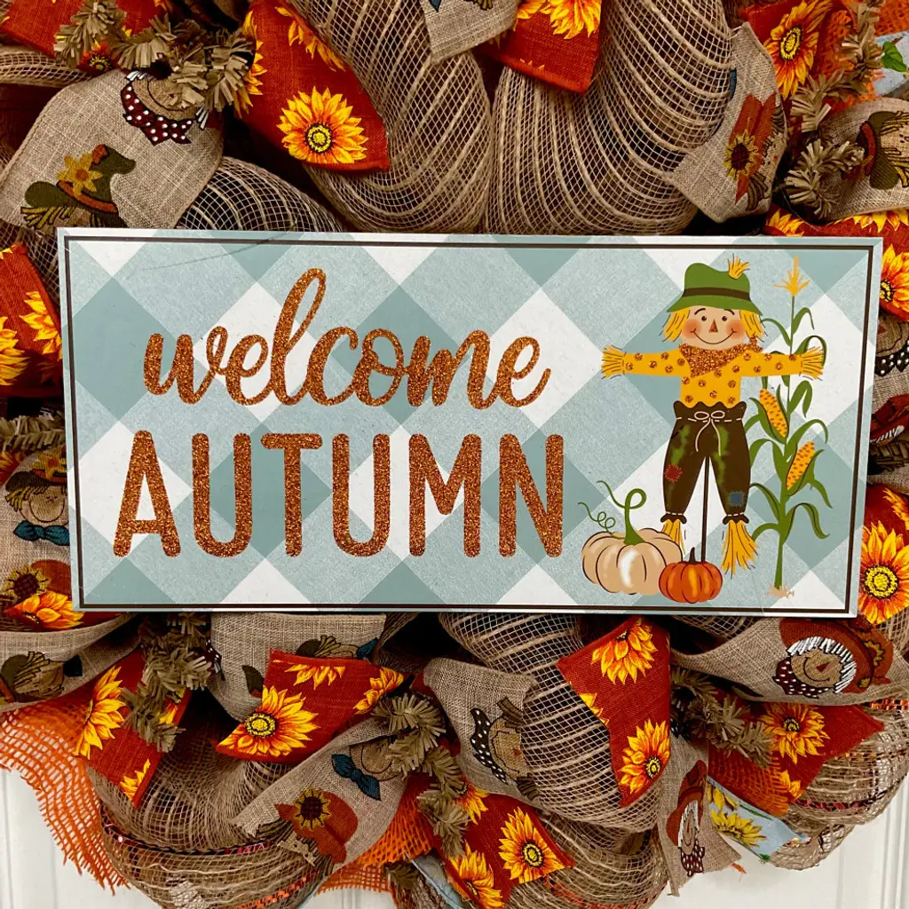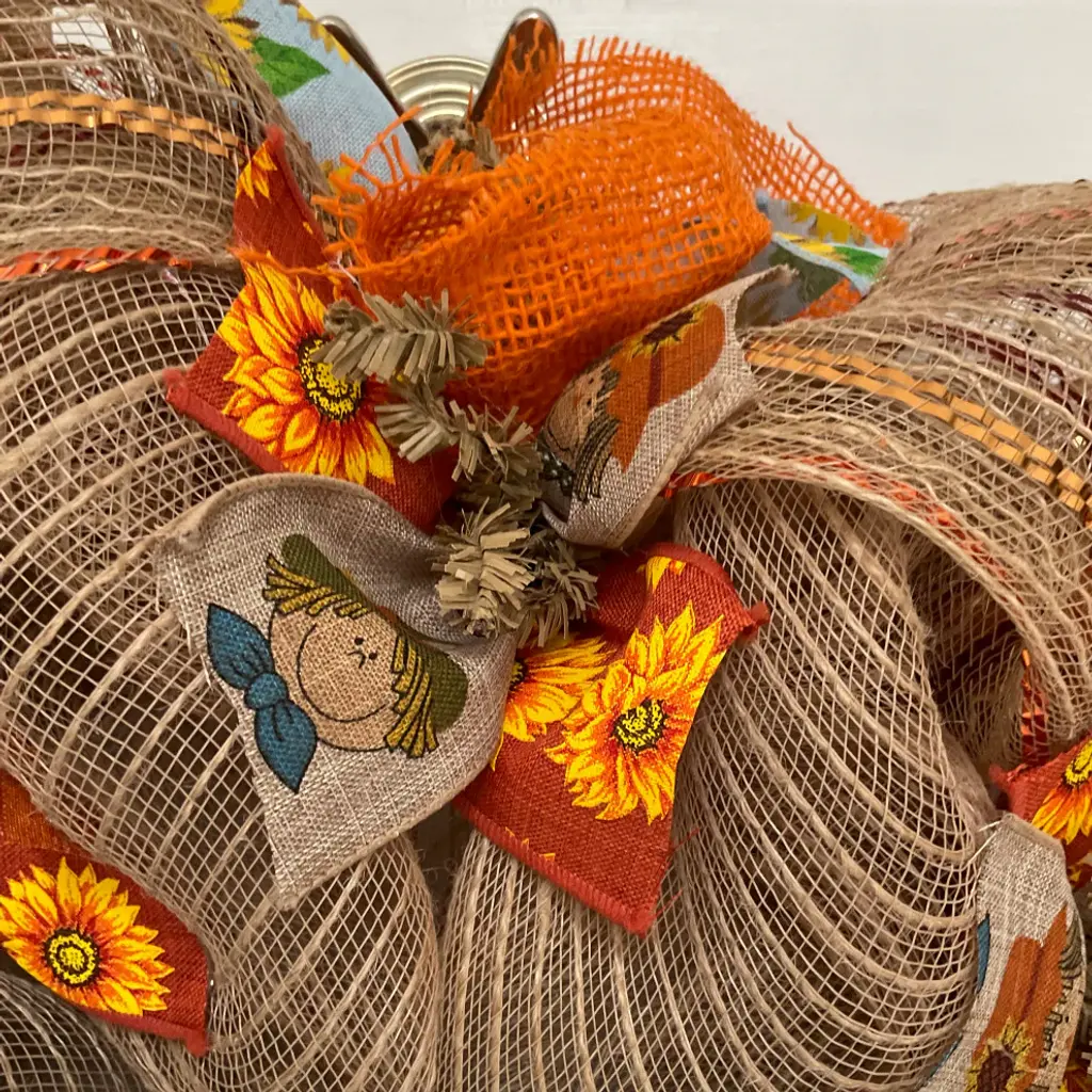 Full! Premium! Large! Handmade Scarecrow Harvest or Halloween Wreath. Perfect throughout Fall, this wreath has a country style. The wreath is made of creamy burlap deco mesh. The inner ring has adorable scarecrow ribbons and orange sunflower ribbons. The outer wreath has beautiful blue sunflower ribbons and orange burlap ribbons. A large, wood, white and blue checked sign is placed in the center. It has the wording "Hello Autumn" in glittering orange lettering. It is decorated with an adorable scarecrow. The outer ring has glittering orange and brown stripes on the burlap. The size is a large 24 inches diameter and 6 inches deep.