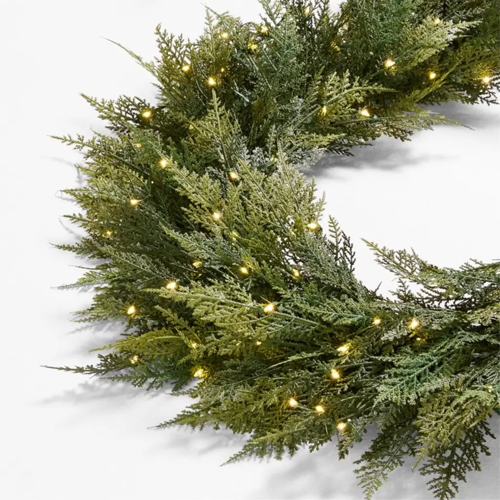Lush and evergreen, our faux pre-lit hemlock instantly updates your home with wintry cheer. Studded with starrywarm white micro LED lights, the fool-the-eye wreath and garland brilliantly recreate hemlock's dark green color and lacy boughs. Switch on the battery-powered set or use the timer and watch them twinkle throughout the night. Display the wreath on an interior door with the garland draped across the doorframe above, or hang the wreath over a fireplace and festoon the mantel with the garland for an infusion of festive holiday sparkle.