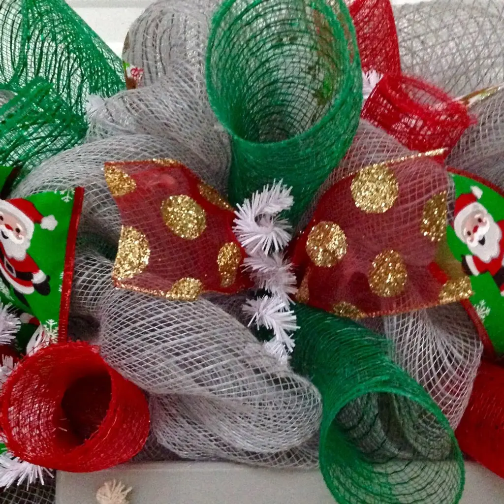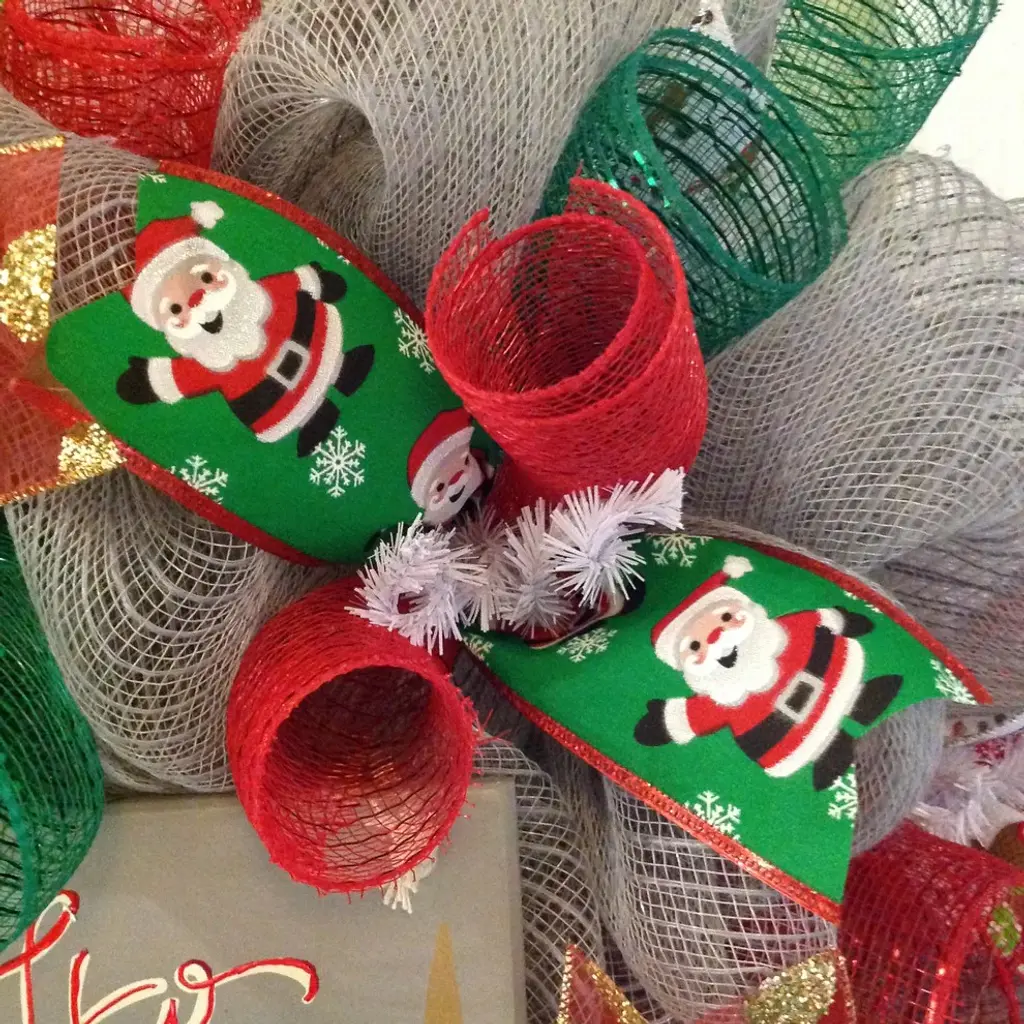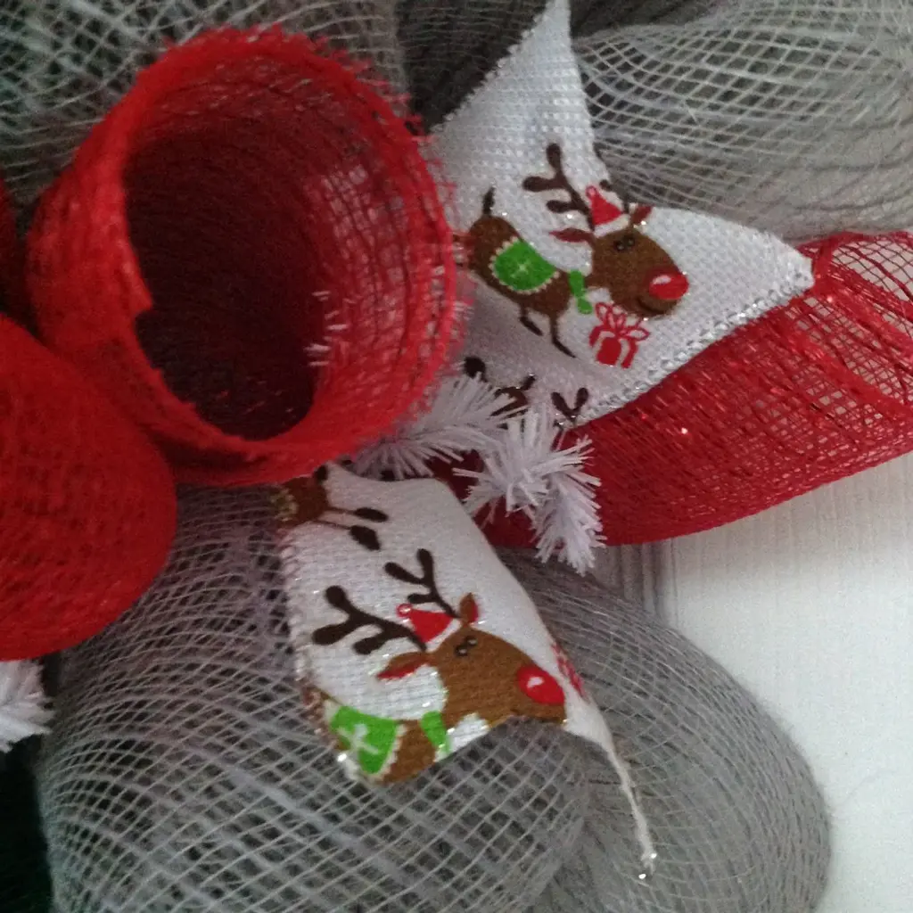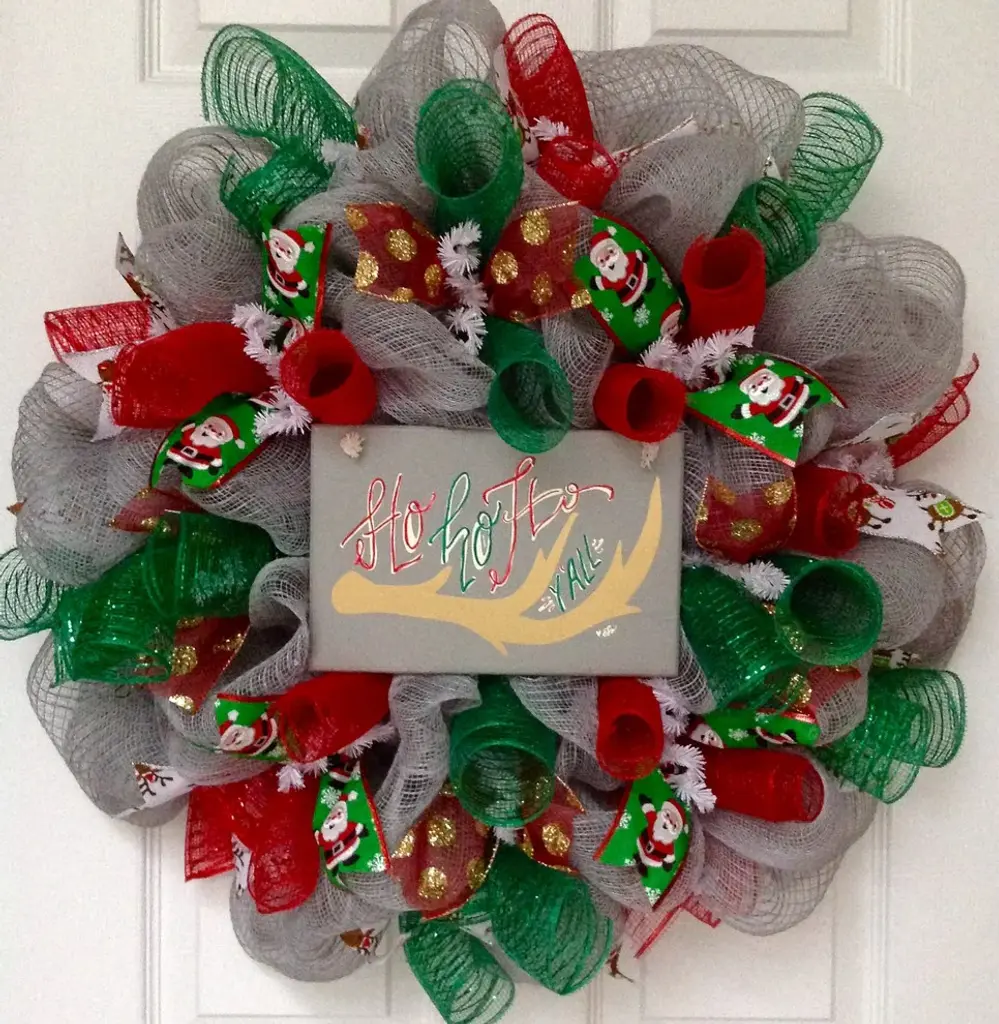 New! Large, Premium Handmade Deco Mesh Christmas Wreath. A silver gray wood plaque with the beautifully scripted words "Ho Ho Ho Y''all" rests on a bed of soft gray burlap. The plaque is decorated with glittering gold reindeer antlers and the letters are decorated in festive green and red colors. Adorable Santa Claus ribbons and red sheer ribbons with gold glittering dots surround the center. The outer ring has adorable reindeer ribbons. Red and green mesh flutes surround the inner and outer rings. This wreath is very festive and unique with its use of silver gray burlap. Size is large, 24 inch diameter and 6 inch depth. Please see photo for size comparison.