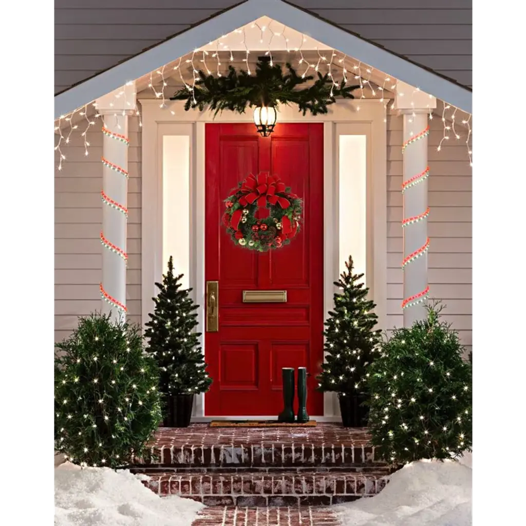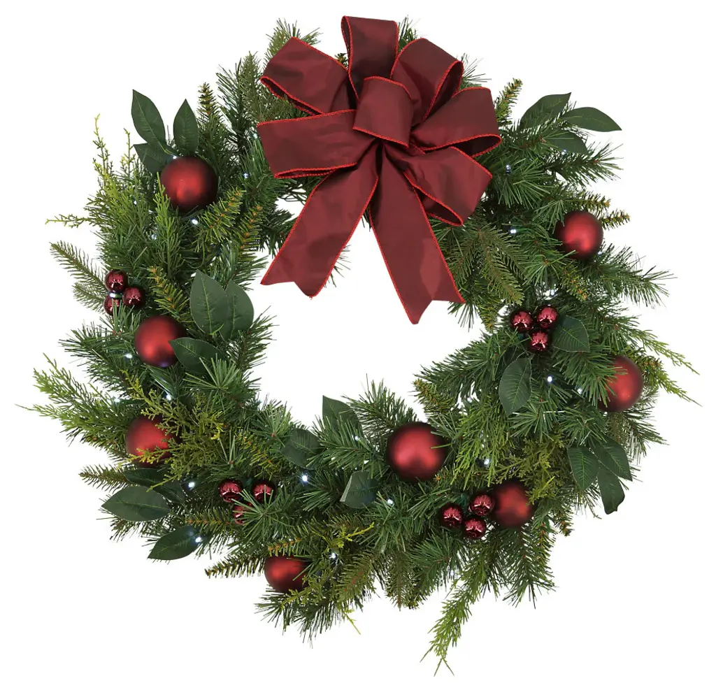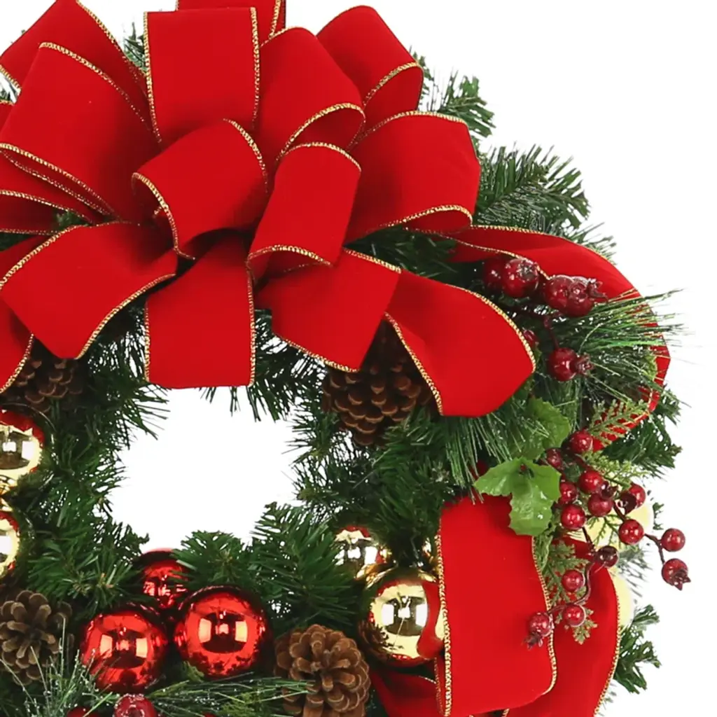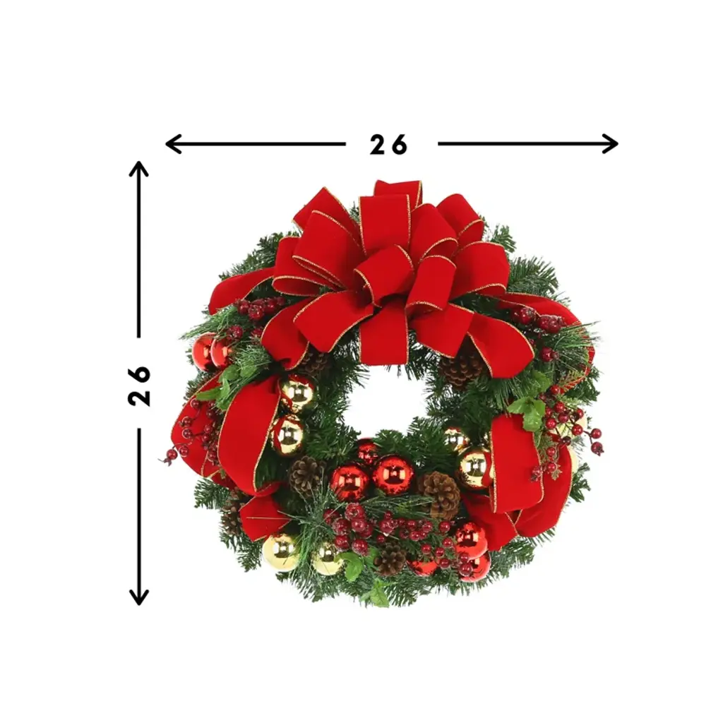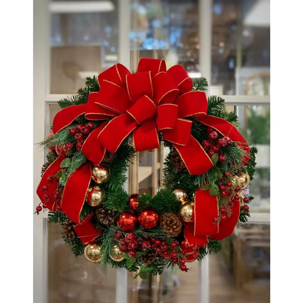 Welcome the holidays into your home with our festive glam style holiday handcrafted wreath. Designed with a sprinkling of mixed red berries, natural pinecones, red and gold ornaments, greens and embellished with a red and gold ribbon on an evergreen holiday wreath. Our wreath will look lovely indoors or in a protected area away from the weather.