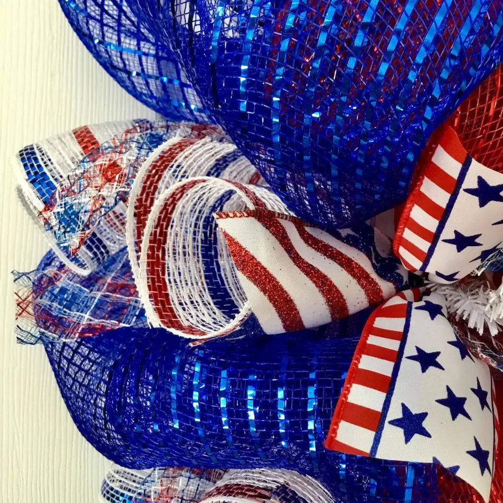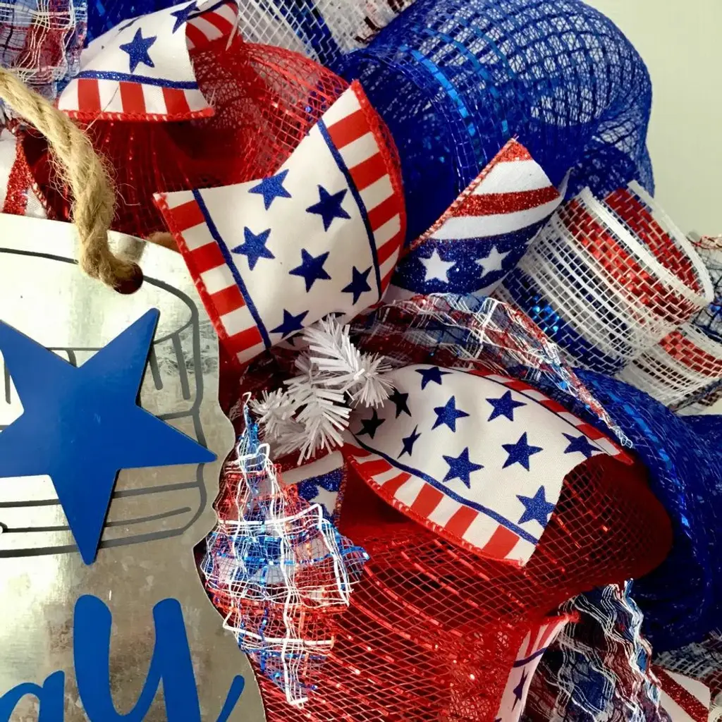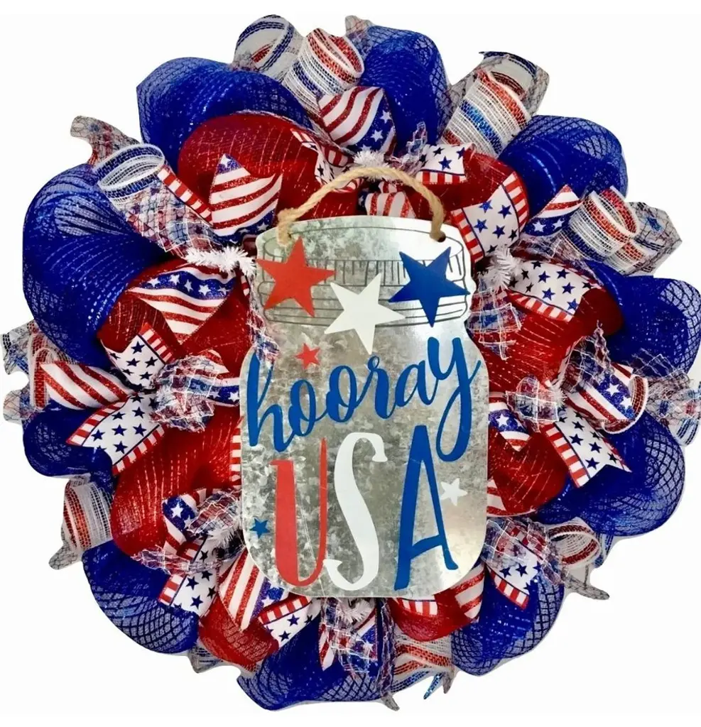 Beautiful, New, Large, Full, Premium, Handmade, Deco Mesh door or wall wreath. This wreath has long ribbons placed all around the wreath! Made of durable mesh, the outer ring is royal blue and the inner ring is shimmering red. Mesh flutes of red, white and blue striped mesh along with patriotic colored flex ribbons are placed along the exterior. White ribbon with Stars and Stripes along with white satin stars and striped ribbons are placed along the center. Patriotic colored flex ribbons are placed around the inner ring. Highlighted in the center is a metal mason jar shaped accent with a rope handle. The accent is decorated with red, white and blue stars and has the wording "œHooray USA."� Size is large, approximately 24 inches in diameter and 6 inches deep. Perfect for all patriotic holidays, classrooms, government buildings, law offices or home decor