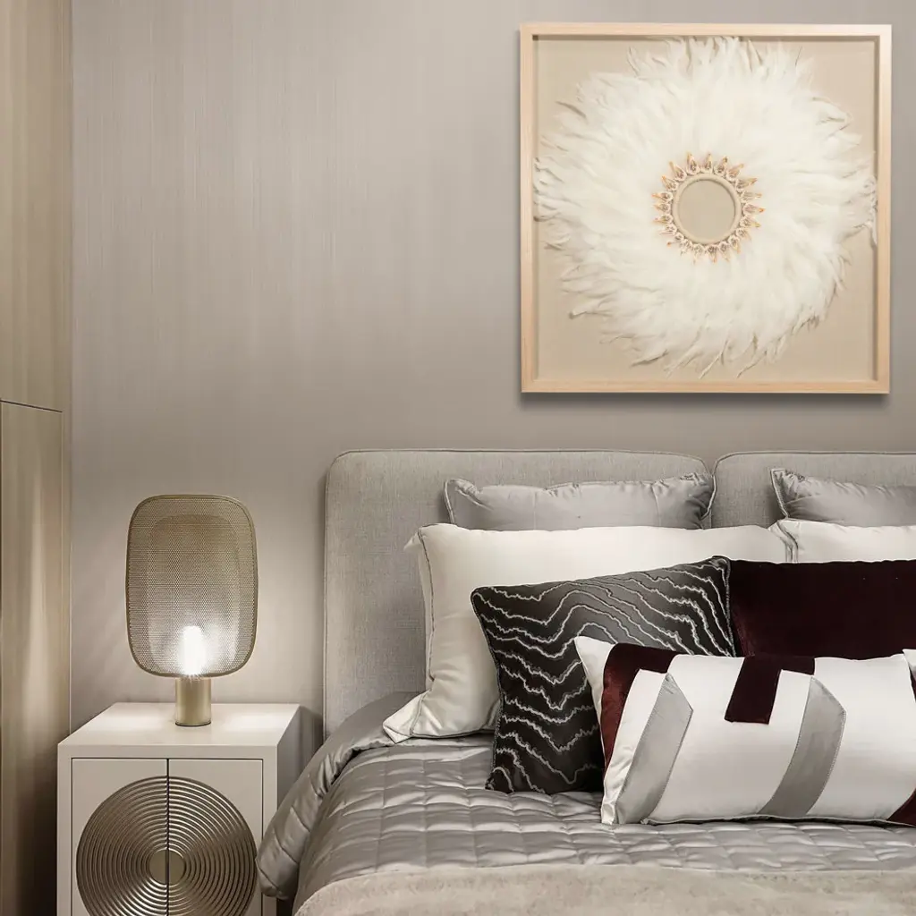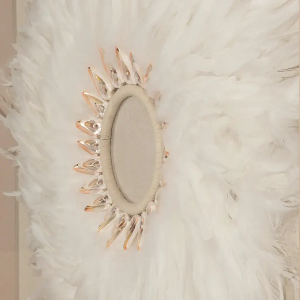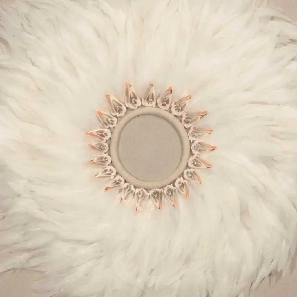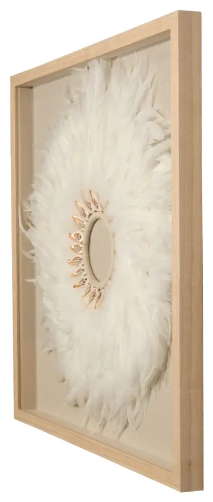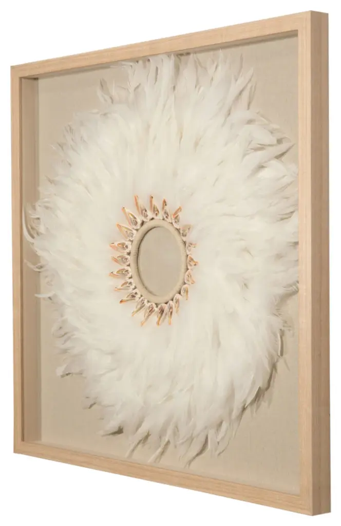 Our Feather & Shell Wreath Shadow Box Wall Décor can turn any room in your home/office into an elegant, upscale space. Our in-house craftsmen handpicked natural shells and rooster feathers then carefully arranged them into a unique wreath inside a glass paneled shadow box with a densely woven linen backing and a wooden frame. The shells were sliced open to expose their intriguing structure. We built this wall décor with durability in mind so you can display it on your wall or countertop for years with minimum maintenance required. With its fine craftsmanship and strong presence, our Feather & Shell Wreath Shadow Box Wall Décor is ready to elevate any room to a new level of sophistication.A double shell ring version is also available. Unlike anything mass-produced, this HUJI wall décor set were handmade by our experienced in-house craftsmen using natural material. Every single one are unique and irreplaceable. Actual product may vary from website picture.