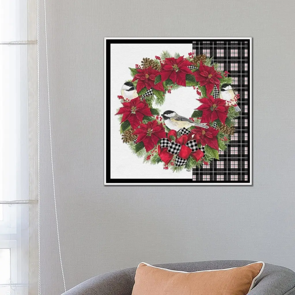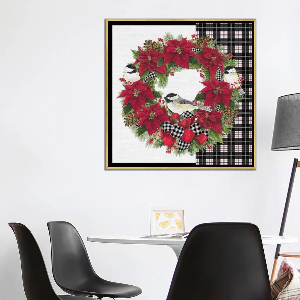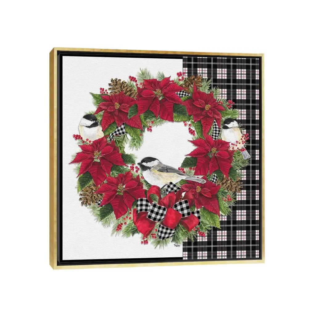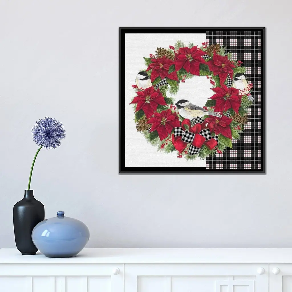 Icanvas "Chickadee Christmas Red V - Wreath" By Tara Reed Framed - Black - 18x18