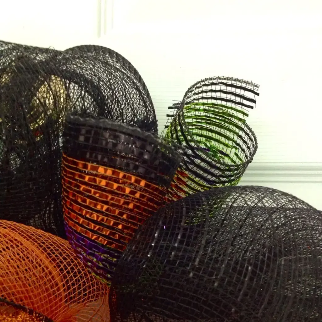 New! Full! Premium Handmade Deco Mesh Halloween Wreath. The wreath is made of shimmering black deco mesh with metallic orange, black and green mesh curls around the outer ring. The inner ring is made of bright metallic orange deco mesh and has beautiful sheer black, with glitter green, purple and orange zip zag design ribbons and metallic purple, black, orange flex ribbons. The center of the wreath has a large wood sign which says "If The Shoe Fits." It is decorated with witch''s purple and white striped stockings and green dotted shoes in bright Halloween colors. Black and white polka dot ribbons are placed on the shoes.m Simply Adorable! Great Halloween decoration for doors, windows or walls. The size is 24 inch diameter and 6 inches deep. Please see photo for size comparison
