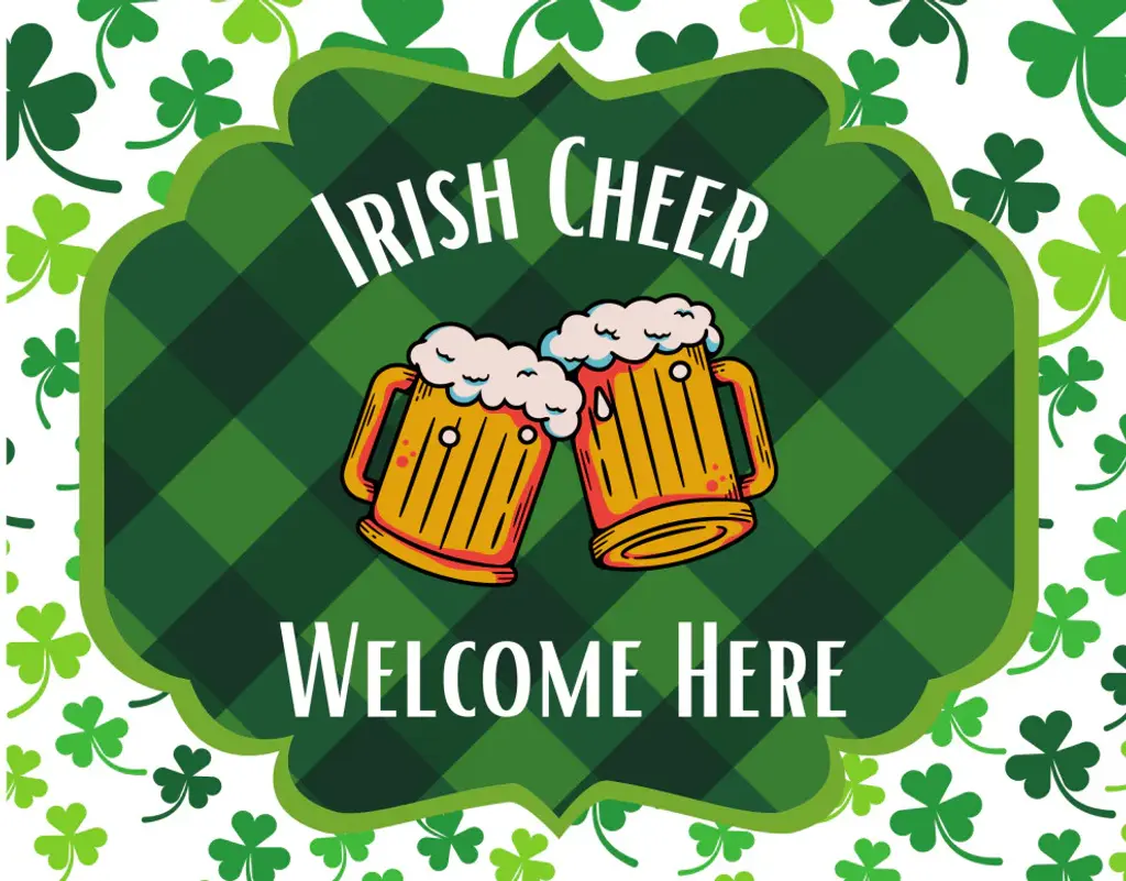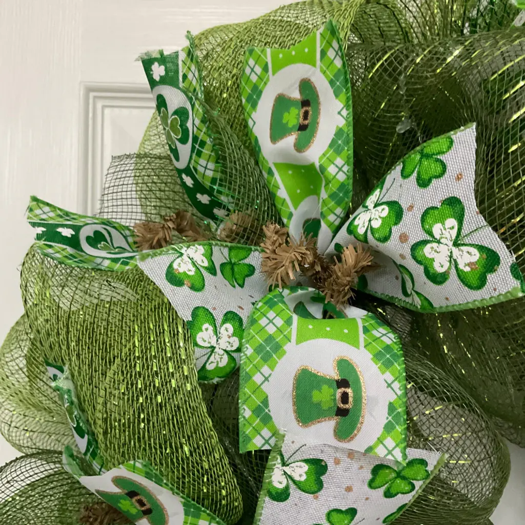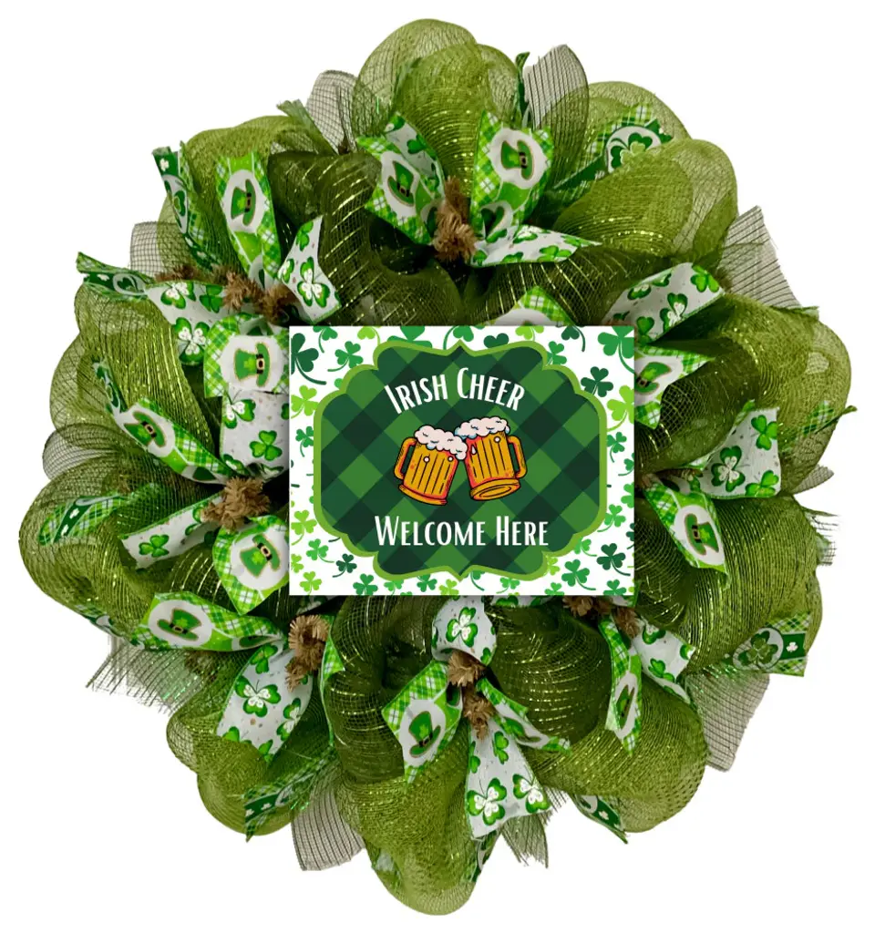 Handmade Deco Mesh St Patrick''s Day Wreath. A uv protected, aluminum sign rests on a bed of moss green deco mesh. The sign is decorated with shamrocks and beer mugs. Irish Cheer Welcome Here'' is written in playful script. Leprechaun hat ribbons and shamrock ribbons surround the accent. The outer ring is apple green/moss two tone mesh and has green shamrock ribbons and moss green mesh bows.. The size is 24 inch diameter and a 6 inch depth. Indoor/Outdoor