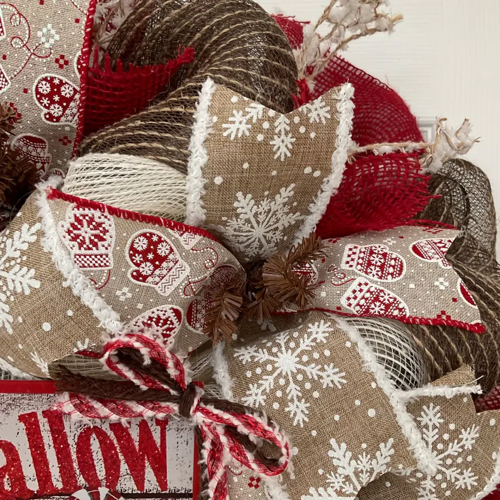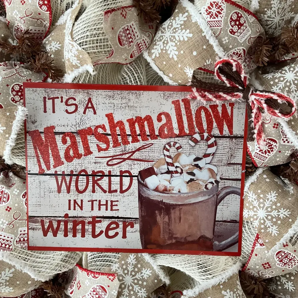 Large, Premium, Full Handmade Deco Mesh Winter or Holiday wreath. An adorable, aluminum, uv protected sign rests on a bed of creamy deco mesh. The sign is decorated with a steaming cup of hot cocoa with a candy cane and marshmallows. The sign has the wording It''s a Marshmallow World in the Winter." Beautiful premium red mitten ribbons and burlap snowflake ribbons are placed around the center ring. The outer ring is made of brown fabric mesh with thin burlap stripes. Red burlap ribbons and burlap snow dotted window pane ribbons surround the exterior. Perfect addition to your front, side or back door, kitchen, or any room in your cozy home. Size is large, 24 inch diameter and 6 inch depth.