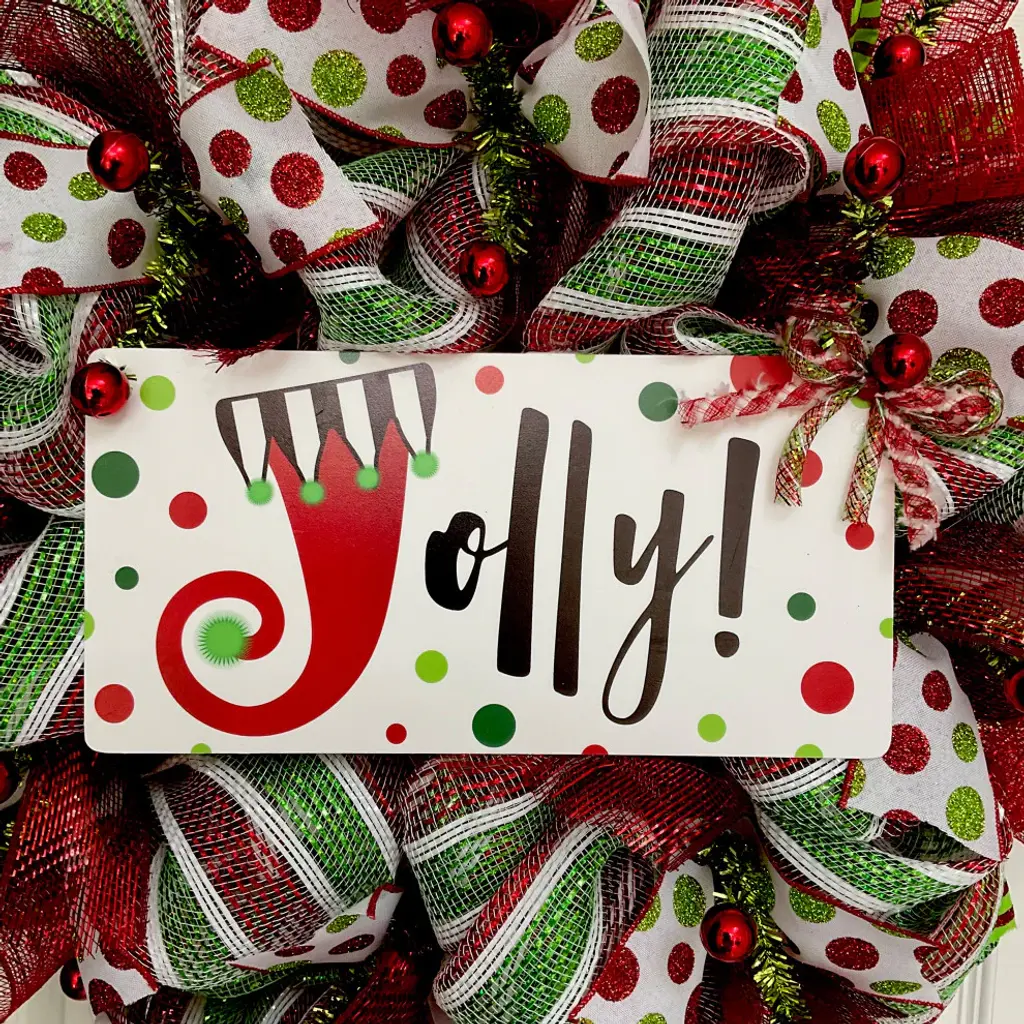 Full, Premium handmade deco mesh Christmas Wreath. This wreath is made of white, red and green shimmering striped deco mesh . The center ring has metallic red mesh ribbons along with festive white, red and green polka dot ribbons. The outer ring has shimmering red deco mesh flutes and red, green striped glitter ribbons. The accent has the wording, "Jolly" and is decorated in beautiful script with an Elf''s shoe for the "J" and Christmas dots. An adorable ribbon rests on the upper border. Metallic green tinsel ties with shiny red balls are placed all around the wreath. The size is a large, 24 inch diameter and 6 inches deep. Indoor/Outdoor