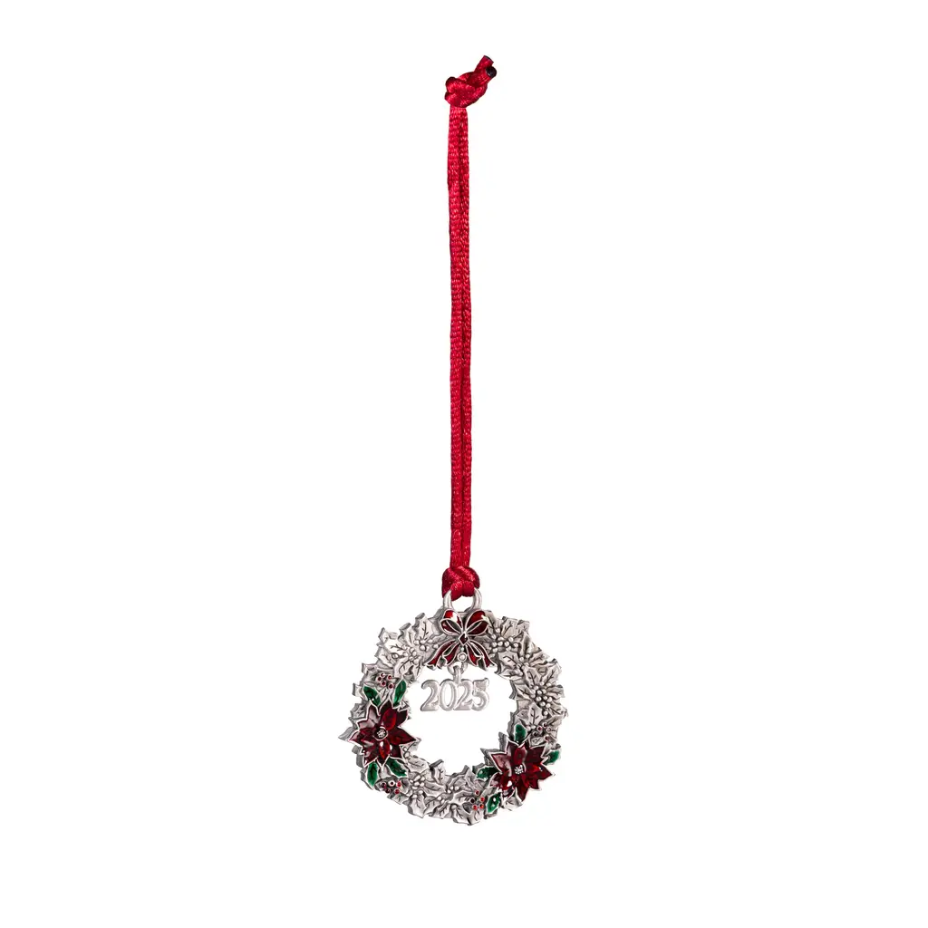 Finely detailed front and back, each original, exquisite design features a red satin hanging cord. Our Pewter Ornaments are not only the perfect way to decorate your tree; they're a delightful way to decorate holiday packages, wreaths, napkin rings, table settings, wine bottles and more. Celebrate the reason for the season with this well adorned wreath ornament with our annual 2025 flair.