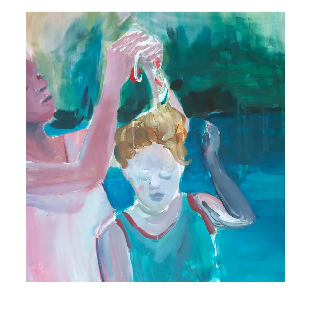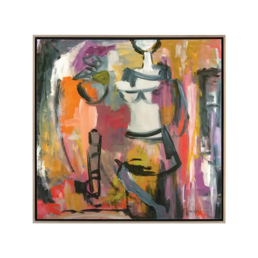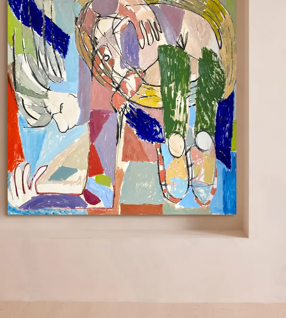 An original portrait created using oil stick, oil colour and wax on canvas. Based in Daphne, Alabama, Austrian artist Barbara Kuebel has shown her work extensively throughout Europe and the US. Inspired by 'awkward social interactions', she creates abstract expressionist figurative portraits rendered as life-sized woodworks that she carves by hand.