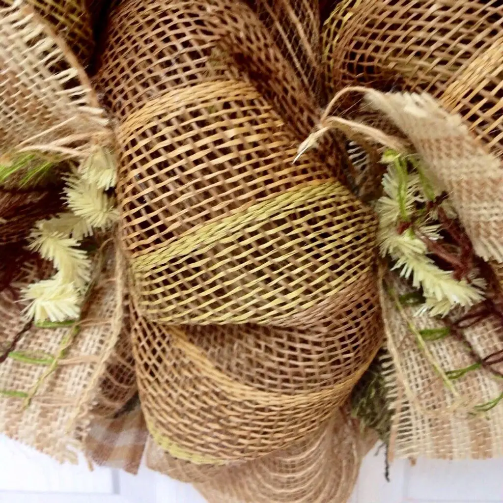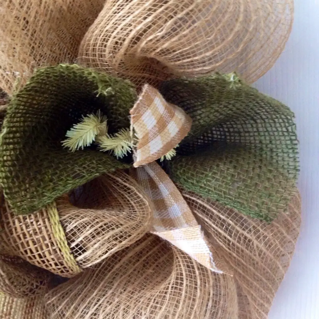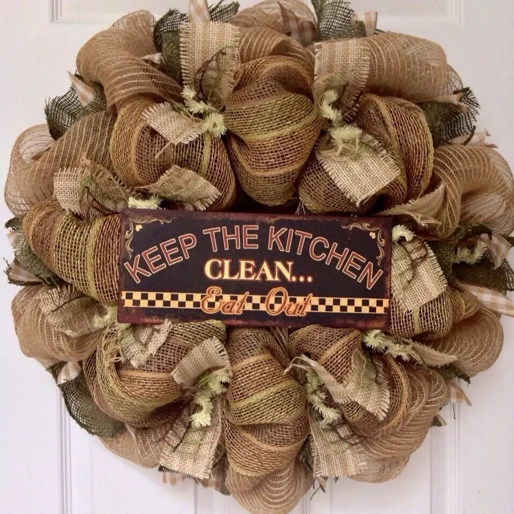 Full! New! Premium! Handmade All Season Deco Mesh Kitchen Wreath. Colors are beautiful shades of muted green, burlap and brown. A large, tin sign decorated with yellow checkerboard boxes and filagreehas corners has the wording "Keep The Kitchen Clean Eat Out." The sign rests on creamy, burlap. The inner ring has green, tan and brown plaid poly mesh along with cream and beige striped frayed burlap and window pane ribbon. The outer ring has green burlap and cream and beige plaid ribbons. Measurement is a large 24 inches and approximately 6 inches deep. See photo for size comparison. Perfect addition to a cozy kitchen or breakfast nook."¨"¨