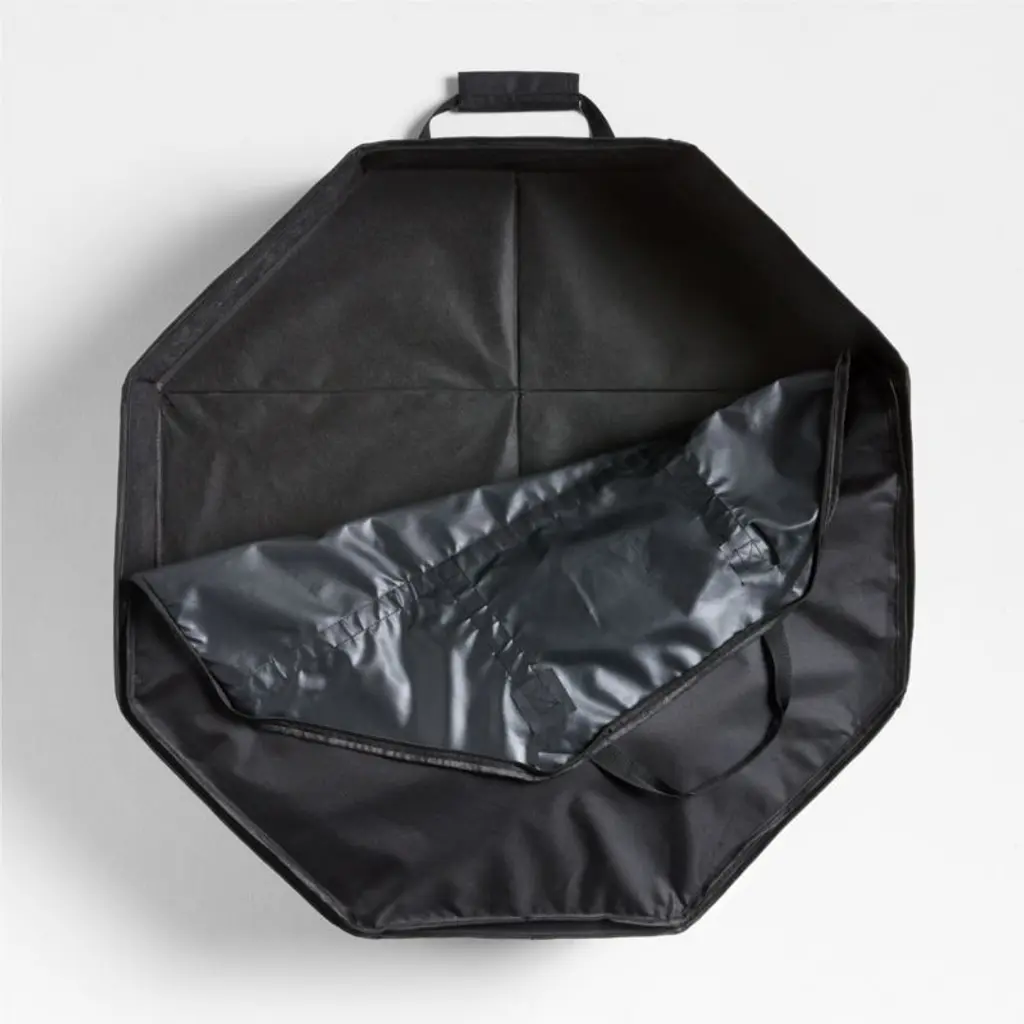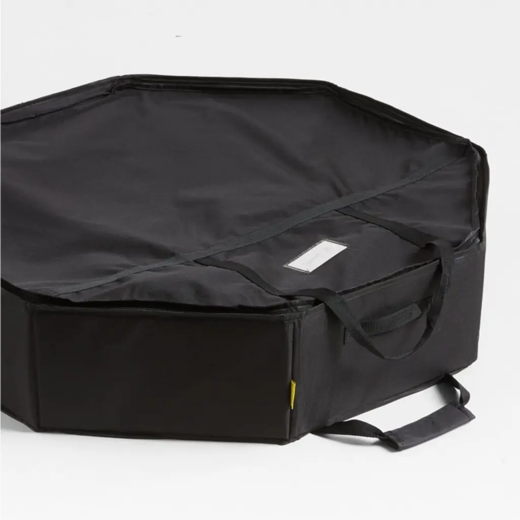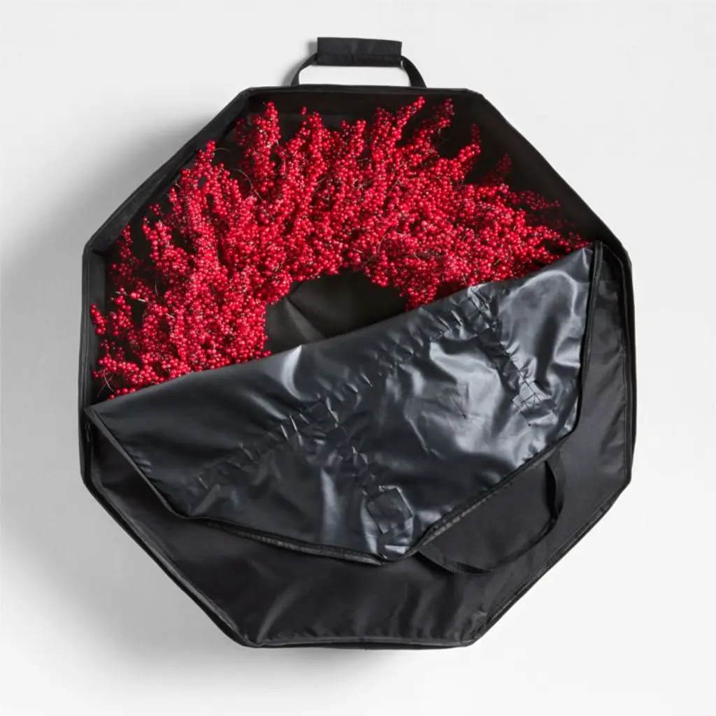 This clever bag makes it easy to safely store, unpack and put away your faux wreath every year. Handsewn by skilled artisans, this tote is constructed of sturdy black fabric that resists water and abrasions. Hardshell walls protect your wreath, then collapse when empty for compact storage. Reinforced handles take the strain out of toting your large wreath back to the garage, attic, basement or closet once the holidays have come to a close.