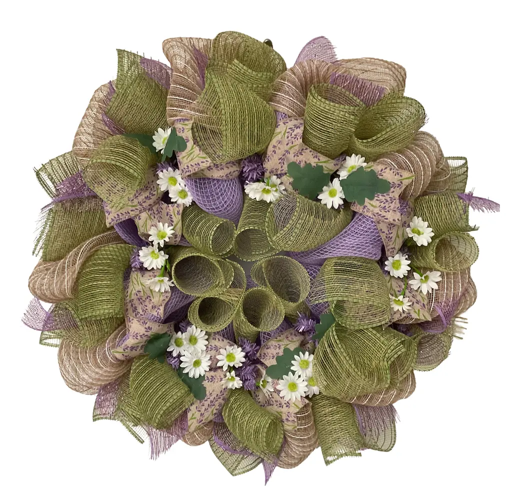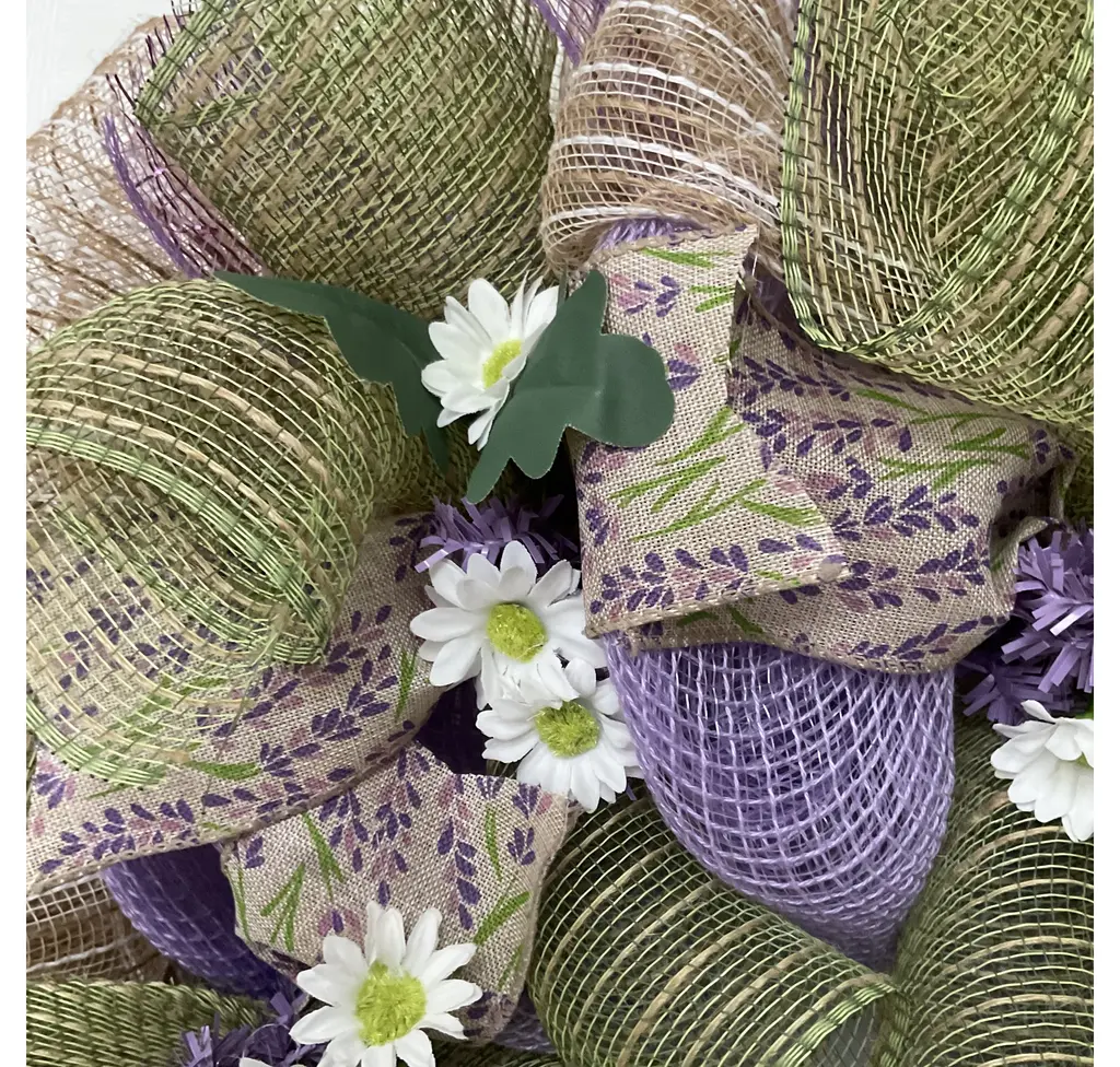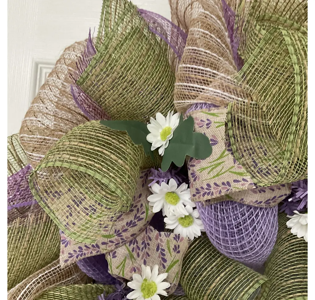Absolutely gorgeous handmade deco spring or summer door Wreath. Perfect for the Easter season! The center ring has beautiful canvas ribbon with tiny lavender flowers and green mesh flutes. The outer ring is made of white and beige striped cotton jute mesh. Green flutes and lavender mesh ribbons surround the exterior. Bouquets of daisies placed all around. Sizes available are large, 24 inch diameter and 6 inches deep or extra large, 27 inch diameter and 6 inch deep