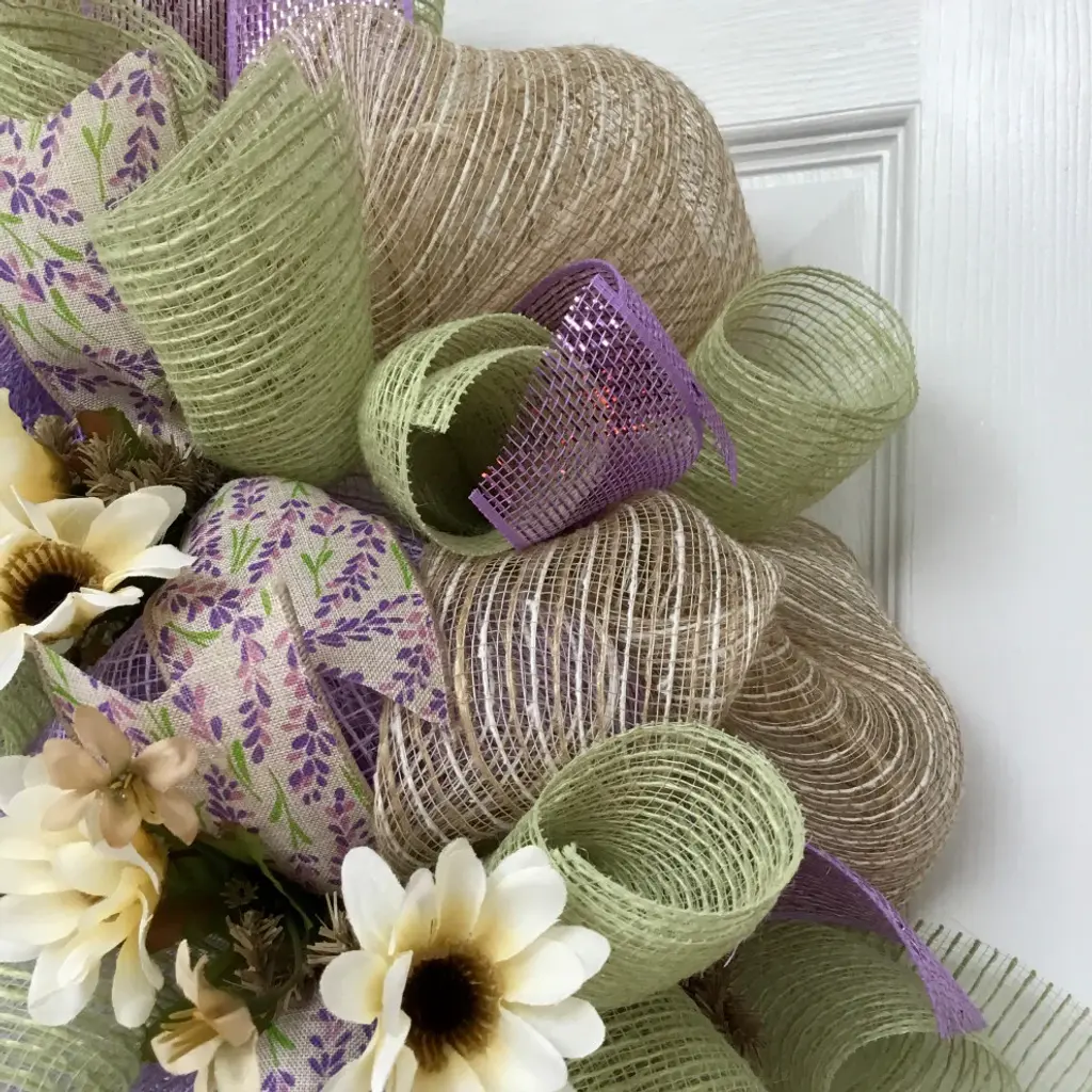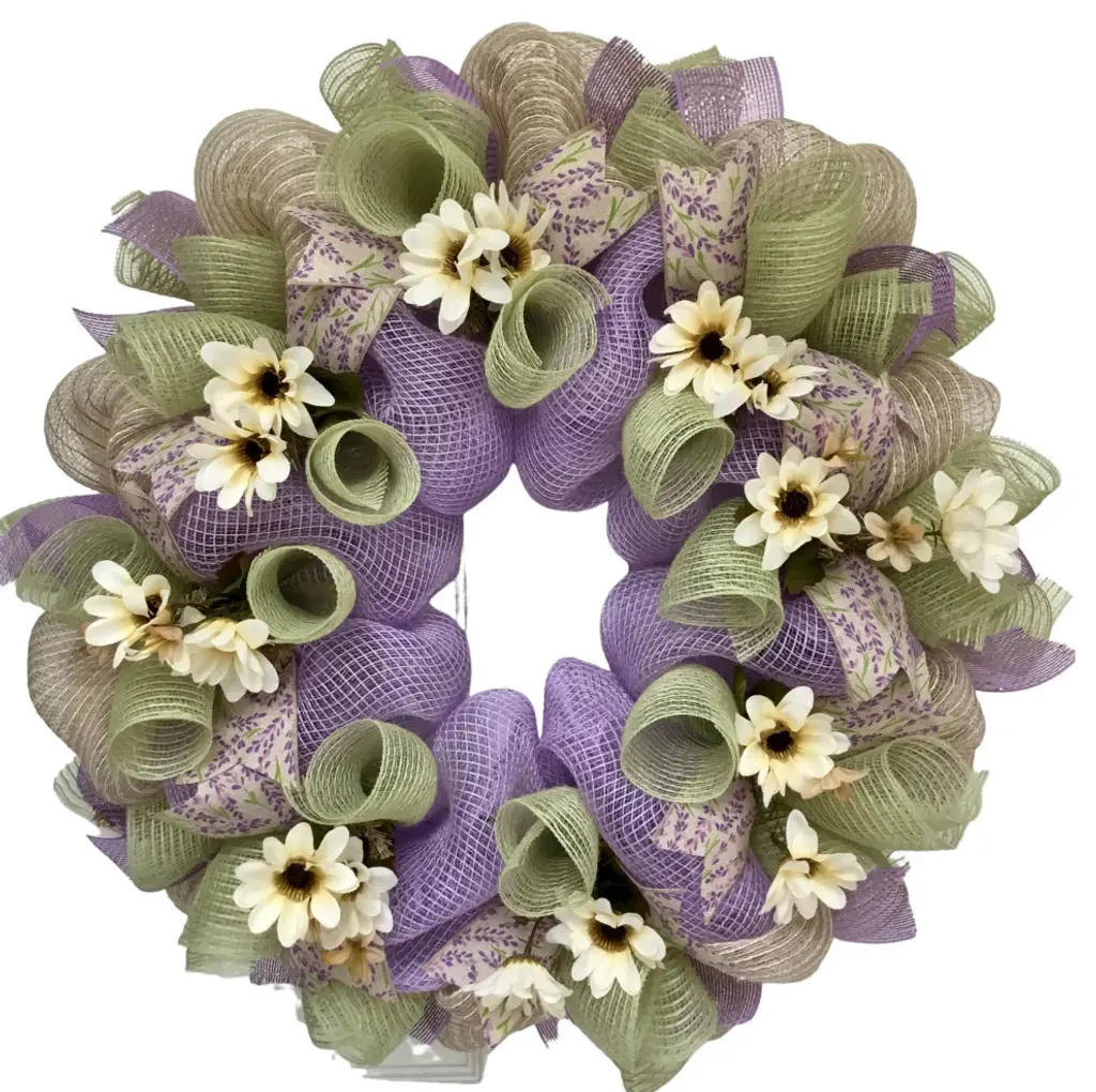 Absolutely gorgeous handmade deco spring or summer door Wreath. Perfect for the Easter season! The center ring has beautiful canvas ribbon with tiny lavender flowers and green mesh flutes. The outer ring is made of white and beige striped cotton jute mesh. Green flutes and lavender mesh ribbons surround the exterior. Bouquets of daisies placed all around. Sizes available are large, 24 inch diameter and 6 inches deep or extra large, 27 inch diameter and 6 inch deep