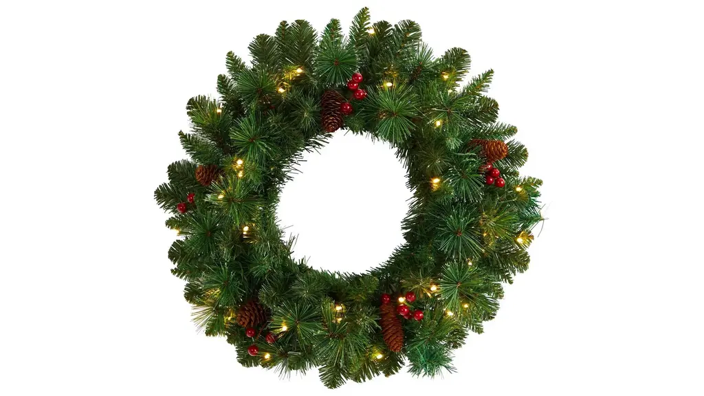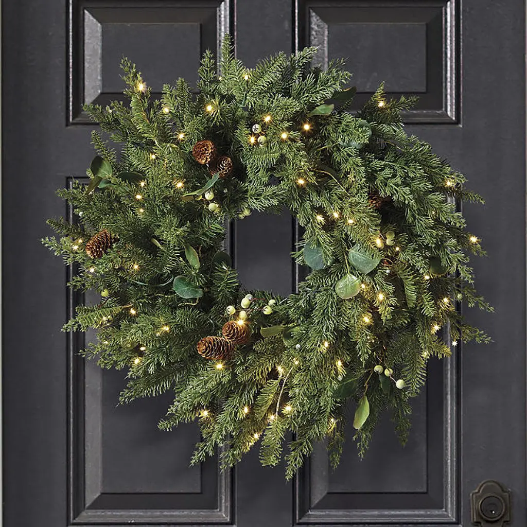 This wreath features a mixture of leafy, long-stem cedar branch tips swirling around a sturdy ring base. It is trimmed with pinecones that add contrasting color and natural appeal. It is pre-strung with 50 battery-operated warm white LED lights that are energy-efficient and long lasting. 6 hours ON/18 hours OFF timed operation. This wreath can be displayed on door, wall, or window in indoor or covered outdoor locations.