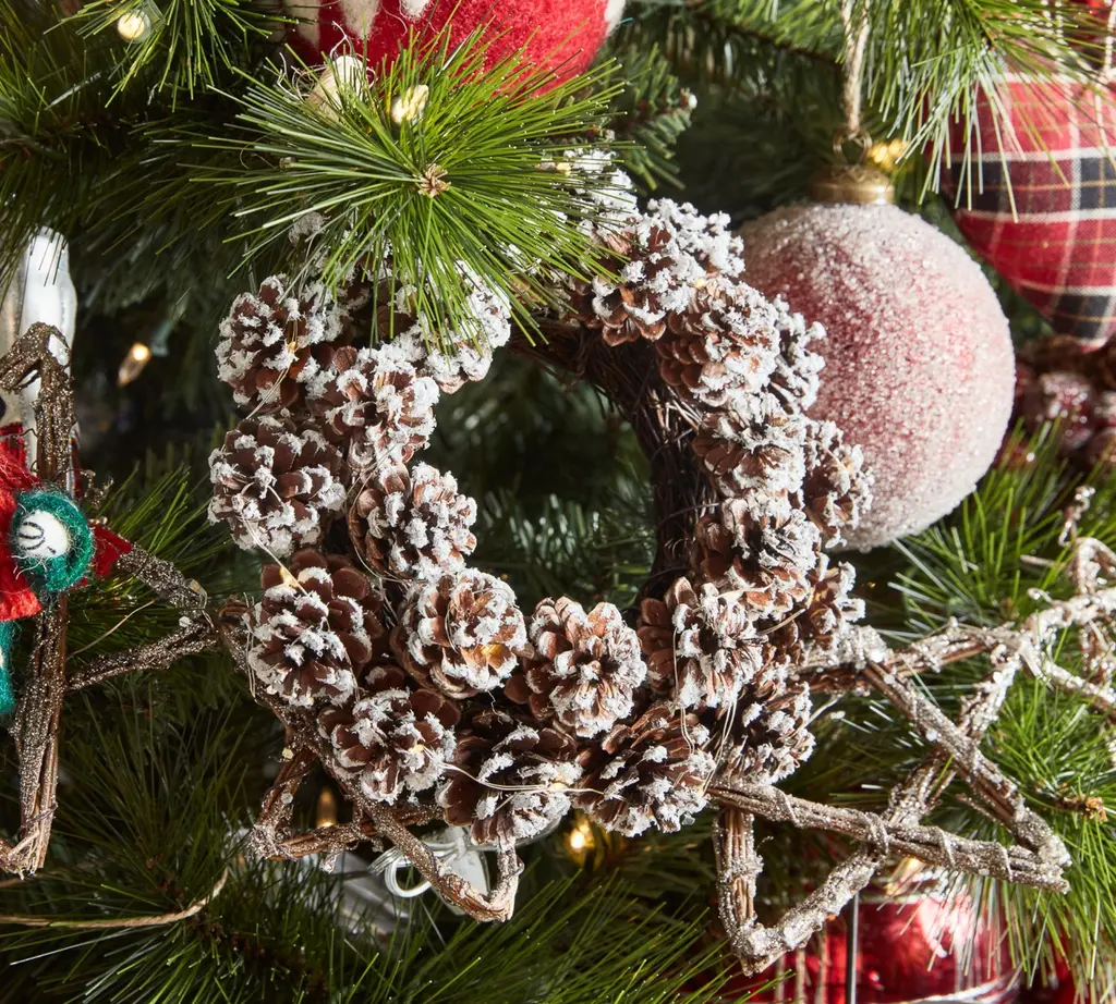 With its earthy, natural pinecones and lifelike dusting of snow, this wreath can greet guests, help set a holiday table, adorn the tree, or accent a hurricane. Bring a bit of nature indoors while adding a cozy winter accent.