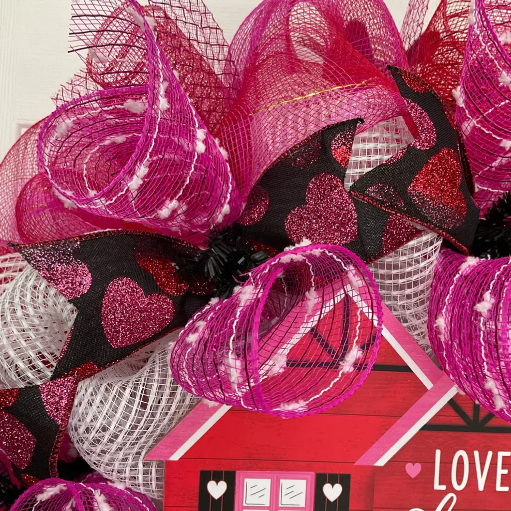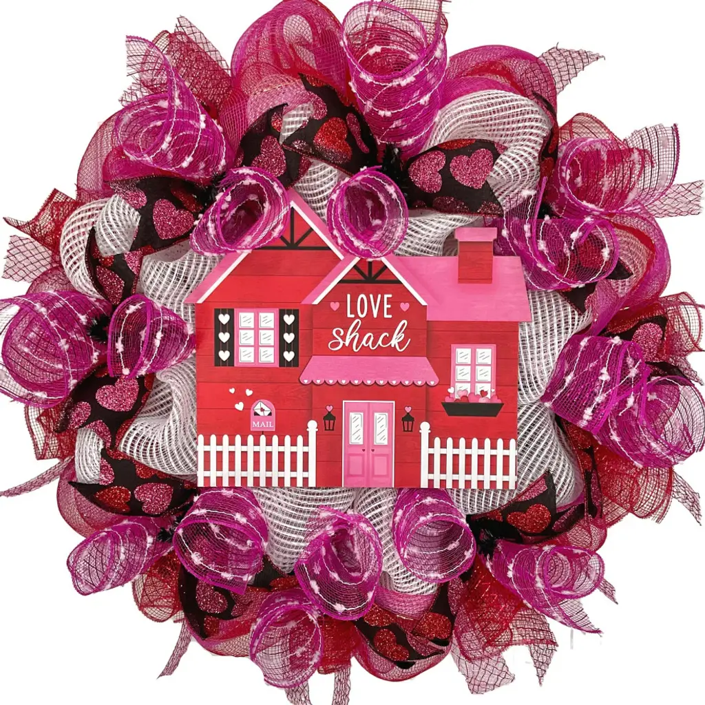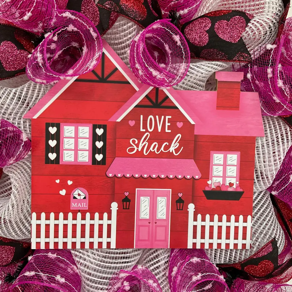 New, Large, Premium Valentines Day wreath. A large, wood, house accent, rests on a bed of white on white striped deco mesh. This cozy home has the wording Love shack. Bright pink mesh flutes with white Swiss dots and black valentines ribbon with glittering red and pink hearts surround the center. The outer wreath is made of colorful pink and red plaid mesh decorated with red metallic deco mesh flutes and bright pink flex ribbons. The size is 24 inch diameter and 6 inches deep. Indoor/outdoor