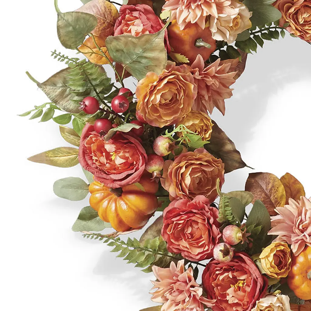 Welcome guests to any space with a beautiful wreath full of fall florals that might be found in a garden alongside vibrant orange pumpkins. Lifelike florals and greenery bring a stylish accent from any angle. For indoor or covered outdoor use Lifelike faux florals and greenery Twig frame Fluff and shape greenery after unpacking Wipe with a soft, dry cloth Imported A Frontgate exclusive. At Frontgate, our primary focus is quality. We guarantee that every product we sell will stand up to the supreme test – our customers' satisfaction. To learn more about our policies, visit our Shipping & Processing, Returns & Exchanges and Warranty & Price Guarantee pages. Welcome guests to any space with a beautiful wreath full of fall florals that might be found in a garden alongside vibrant orange pumpkins. Lifelike florals and greenery bring a stylish accent from any angle. For indoor or covered outdoor use Lifelike faux florals and greenery Twig frame Fluff and shape greenery after unpacking Wipe with a soft, dry cloth Imported A Frontgate exclusive. At Frontgate, our primary focus is quality. We guarantee that every product we sell will stand up to the supreme test – our customers' satisfaction. To learn more about our policies, visit our Shipping & Processing, Returns & Exchanges and Warranty & Price Guarantee pages.