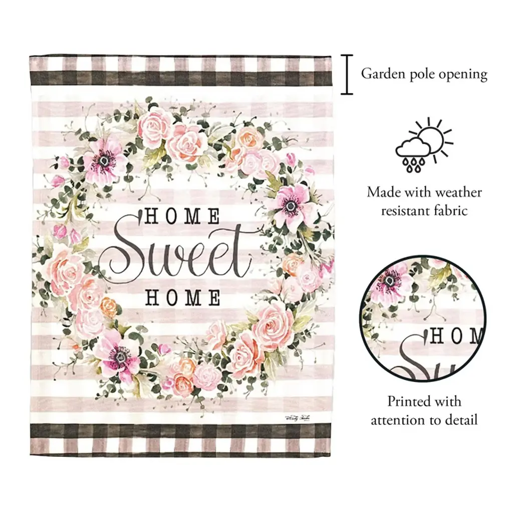 This garden flag by Magnolia Garden is designed with a combination of fabric appliques and exquisitely detailed embroidery on both the front and back; Flagpole sold separately. Features the phrase, "Home Sweet Home" in trendy font inside a floral wreath, set on a checked plaid background. Made of quality polyester double thickness material; These flags are heavier than most others on the market and will hold up for longer, They will retain its color and beauty for years if displayed in shade or semi-shade, and is rainproof; Measures approximately 13 inches wide and 18 inches tall. Perfect for displaying in a garden, on its own or as part of a garden display year-round; Fits most standard garden poles, sold separately; Care Instructions: Handwash in cold water, Air dry with no heat. Contained in protective packaging; Ready for easy gifting for a housewarming, birthday, or any special occasion
