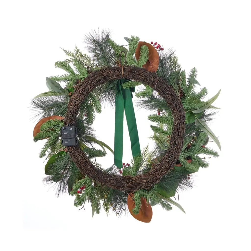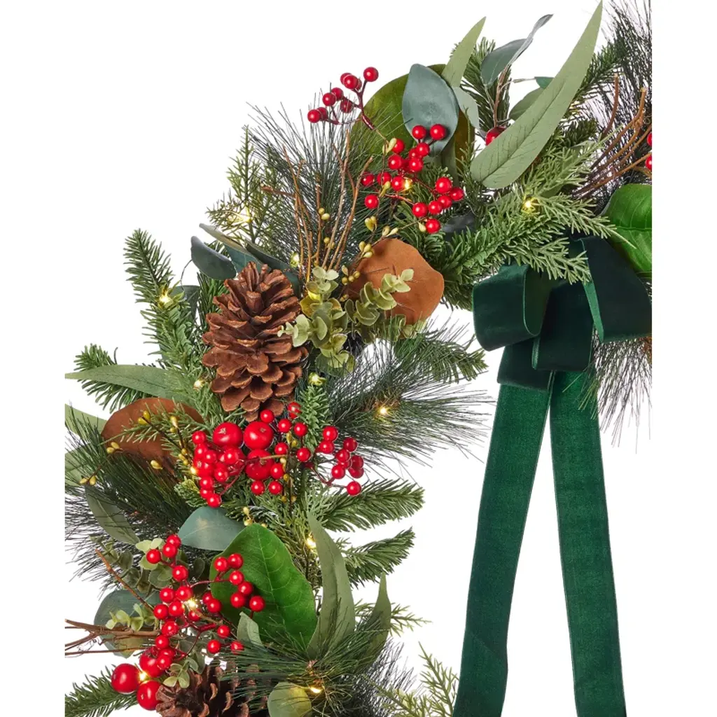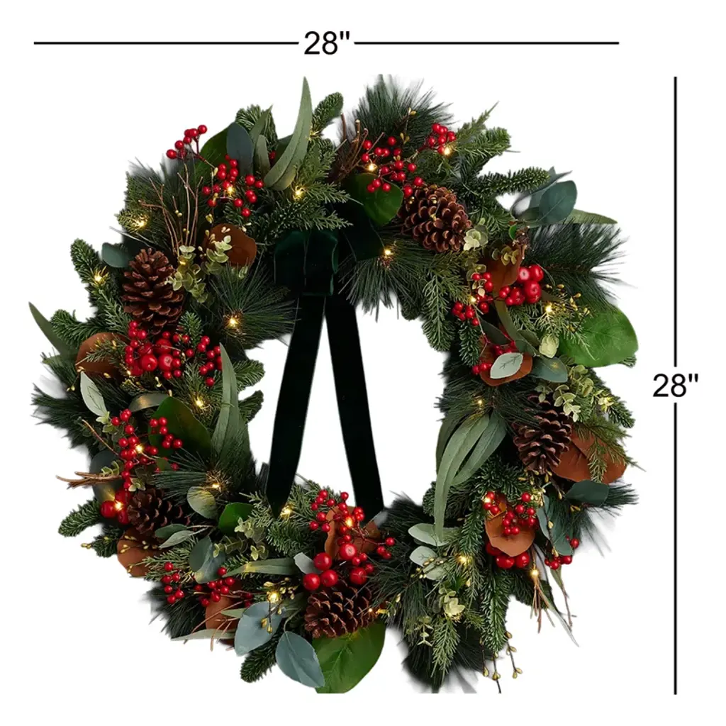 Magnolia Leaf, Eucalyptus, And Berry 28in Wreath, Pre-Lit With 35 Led Fairy Lights B/o