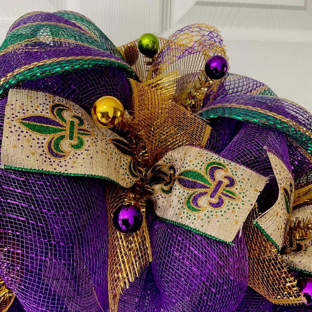 Gorgeous! New, Full, Premium Mardi Gras Handmade Deco Mesh Wreath. A large, glittering Fleur de Lis in gold, purple and green, rests on a bed of shimmering metallic purple deco mesh along with a colorful, sequin Mardi Gras mask. The inner ring has mesh metallic striped ribbons and beautiful fleur de lis ribbons. The outer ring is a metallic green, purple, gold deco mesh. Bright iridescent gold mesh bows and gold, purple flex ribbons add fullness to the outer ring. Decorative balls are placed all around this festive wreath. It is extra large 28 inch diameter, 6 inch depth