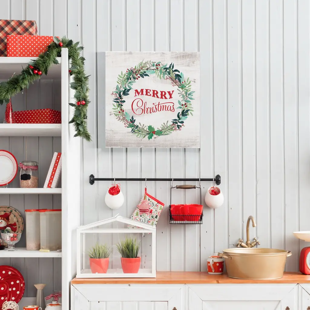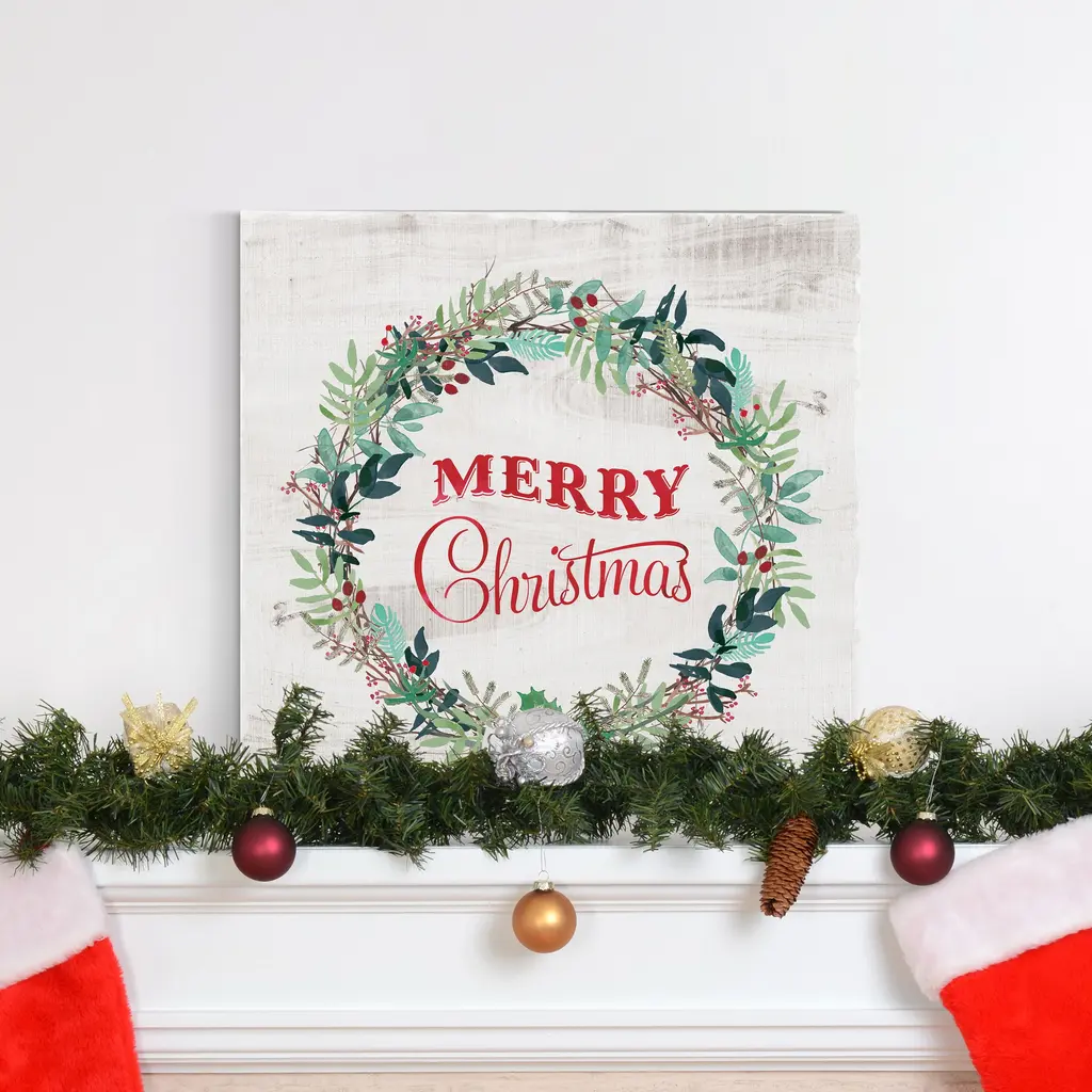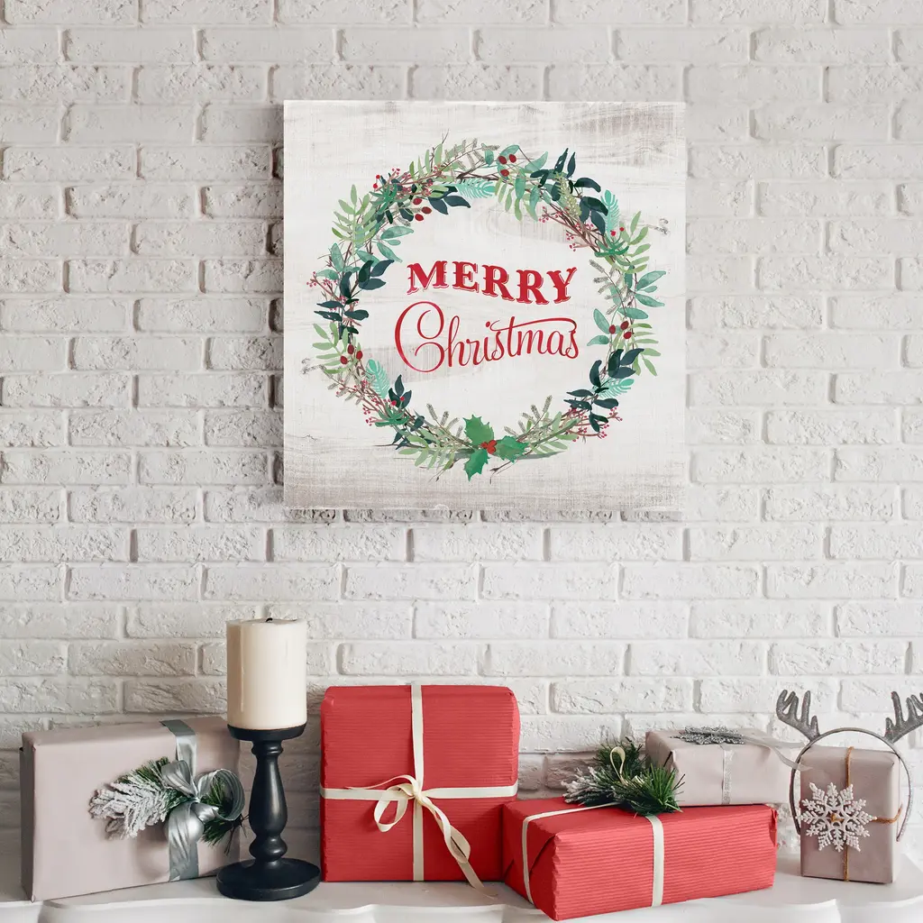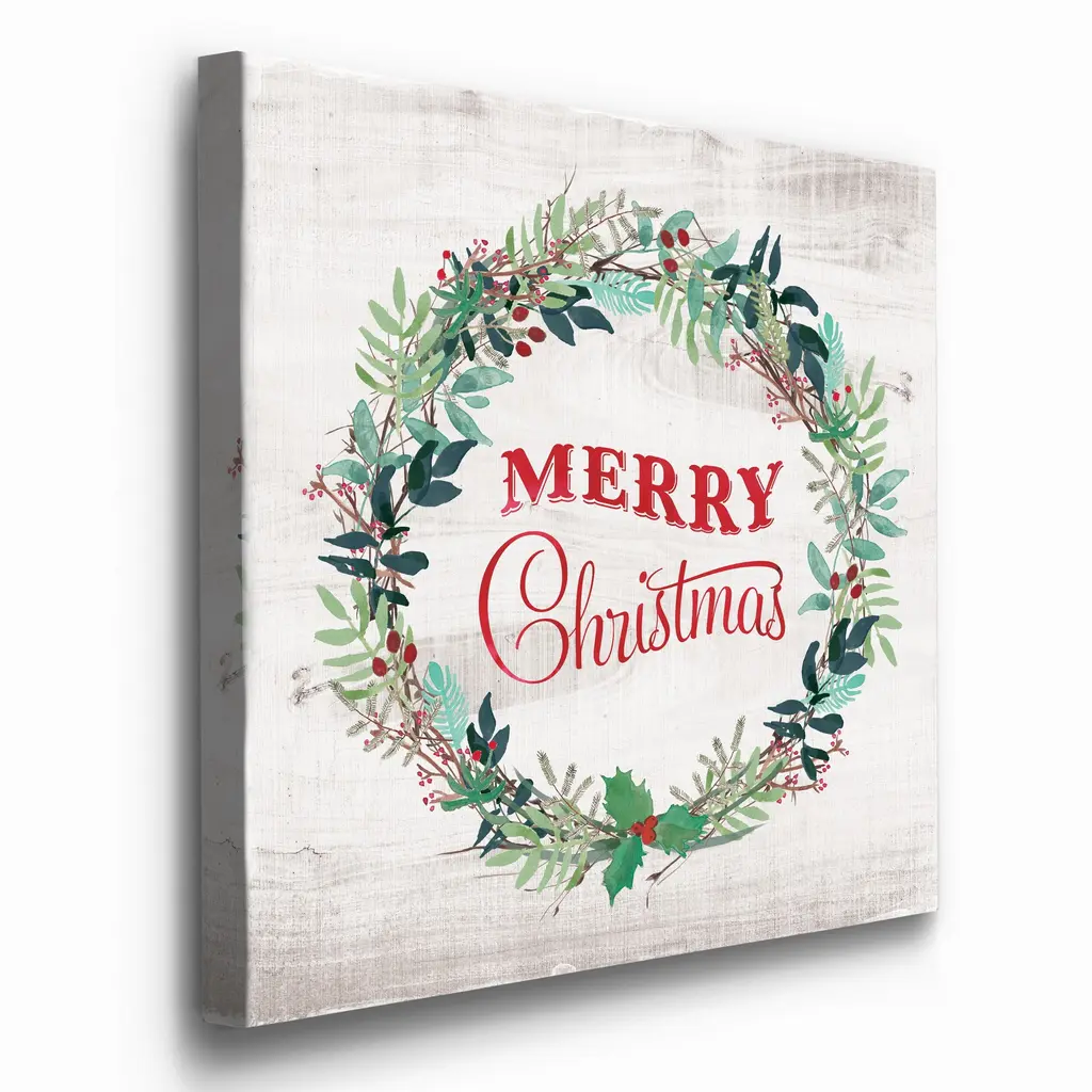 Merry Christmas Wreath-Premium Gallery Wrapped Canvas - Ready to Hang A premium hand stretched gallery wrapped canvas print created to last. Featuring a beveled a solid wood stretcher bar, each piece comes ready to hand 5 SIZES AVAILABLE 10''X10'' - Overall Size 16''x16'' - Overall Size 24''x24'' - Overall Size 32''x32'' - Overall Size 40''x40'' - Overall Size Each piece is made to order. Built to Last Each piece comes ready to hang Solid wood stretcher Fade and Water resistant Made domestically