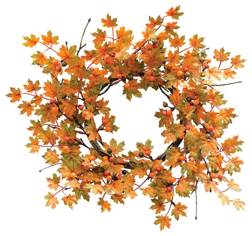 Mini Maple & BerriesWreath has small to tiny faux maple leaves in fall colorswith harvest color foam berries. The base is coated to look like a wood "branch". It measures with a 15" outside diameter and the faux leaves are 1" to 1".