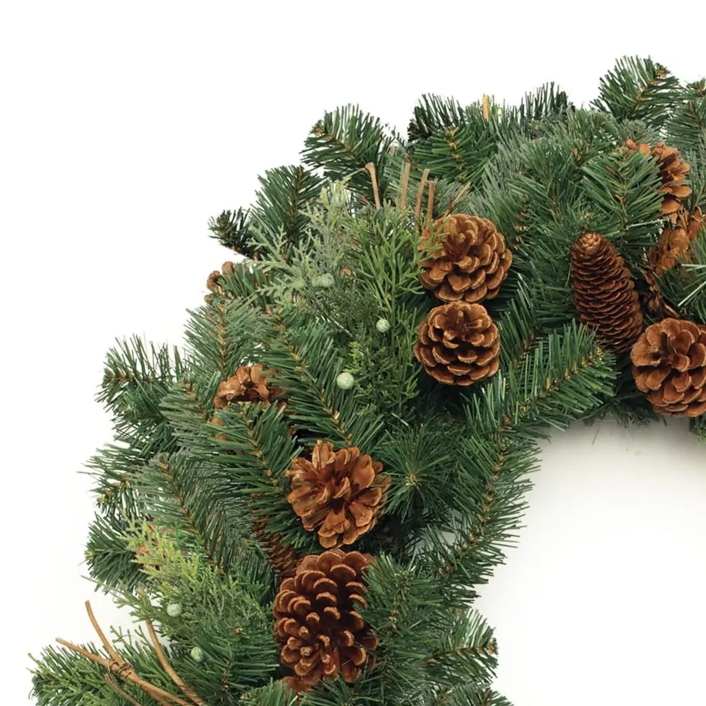 Bring the natural beauty of the outdoors into your home with the Mixed Pine and Pinecone Wreath. This stunning wreath features earthy green and brown tones with variegated pine foliage, complemented by rustic pinecones, juniper branches, and natural twig accents. The wired branches allow for flexible shaping, so you can easily create a dimensional, full-bodied display. Perfect for adding a touch of nature and warmth, hang this wreath on your front door to greet guests or display it near your Christmas tree or fireplace mantle for a welcoming holiday atmosphere.