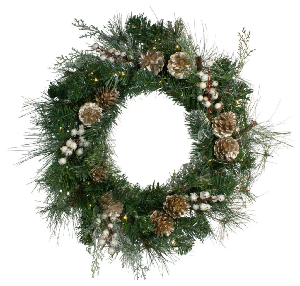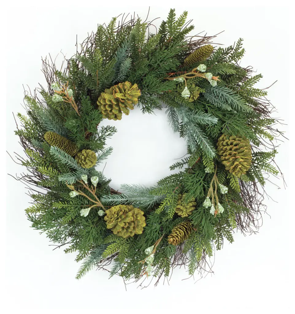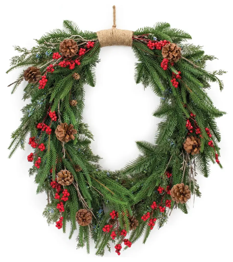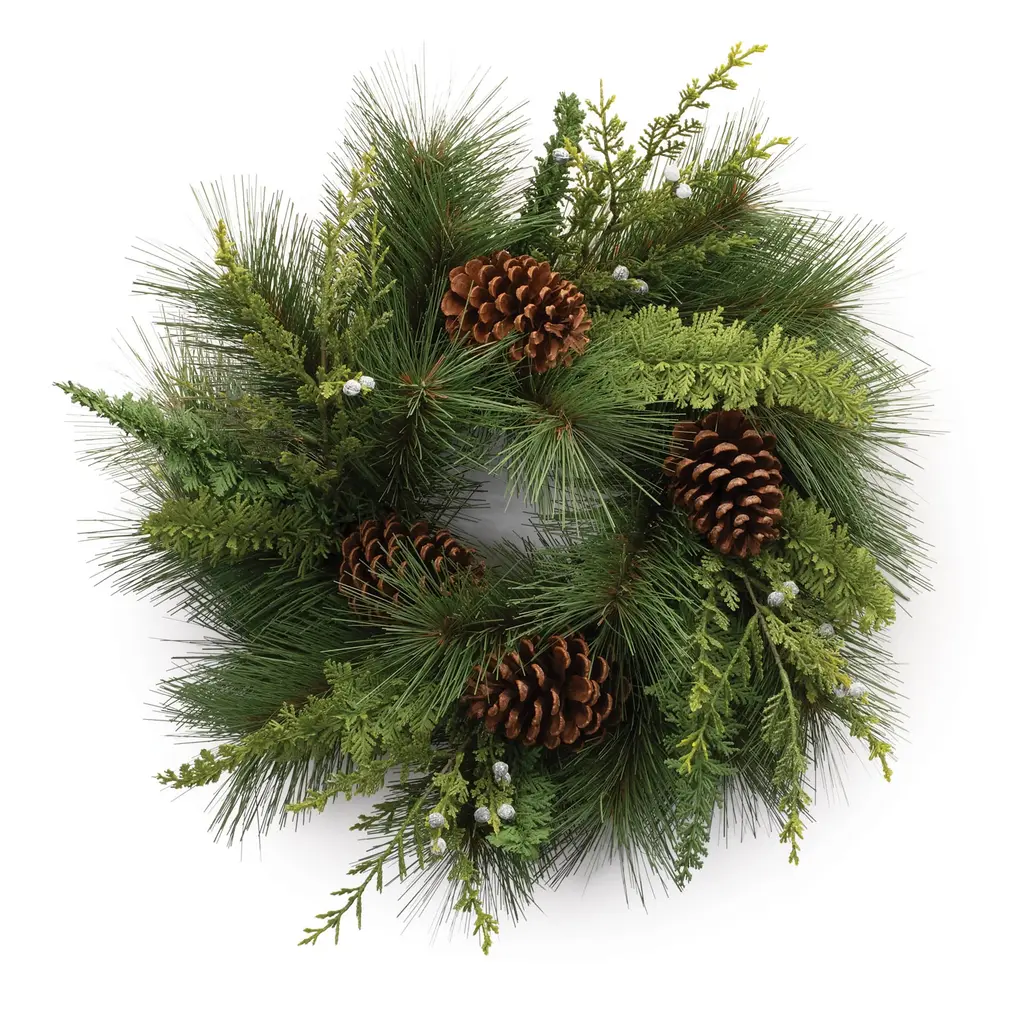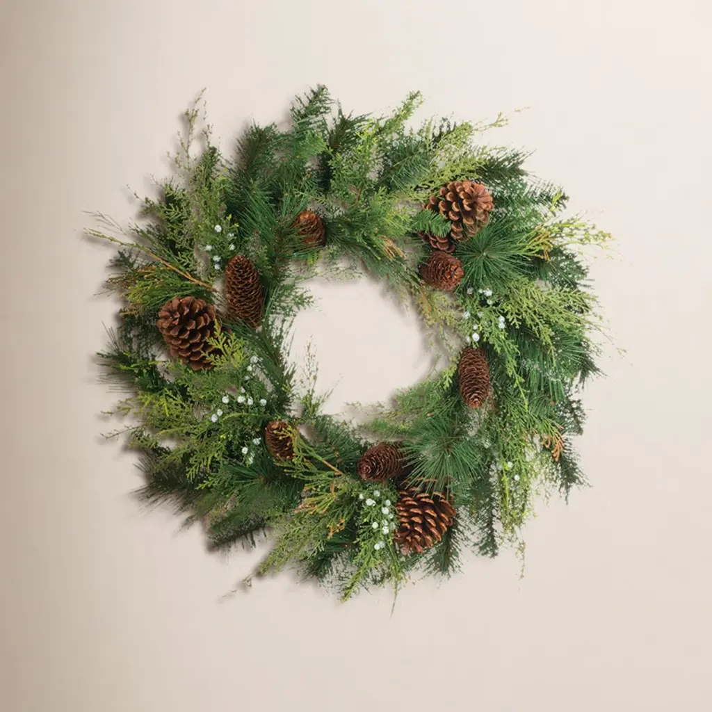 Create a warm and inviting holiday display with the Mixed Pine and Tallow Berry Wreath. This lush 28-inch wreath showcases rustic pine foliage, natural pinecones, and delicate tallow berry accents, bringing a touch of woodland charm to your seasonal décor. The wired branches provide versatile styling and a full, dimensional look, making it perfect for front doors, mantels, or holiday centerpieces. Whether used alone or paired with twinkling lights, this wreath adds a timeless, nature-inspired touch to any space.
