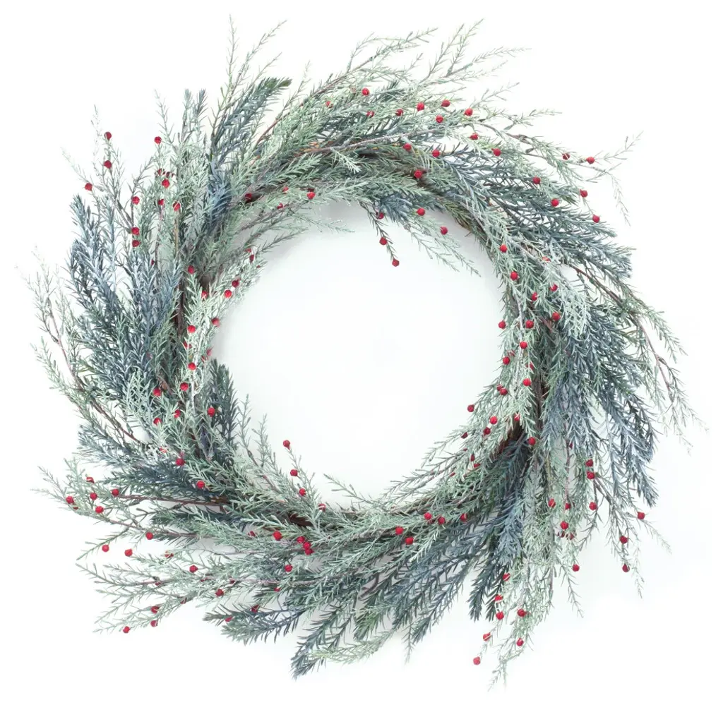This lush and thick pine wreath is the perfect addition to your holiday decor Featuring blueberries, pine cones, iced twigs and mixed foliage Light frosting adds to the winter theme of this stunning wreath Sturdy, metal frame for easy hanging Wreath comes in one piece Dimensions: 24" diameter (measured from outermost tip to outermost tip across the wreath) Inner diameter: 11" Material(s): PVC/plastic/foam/metal/glitter