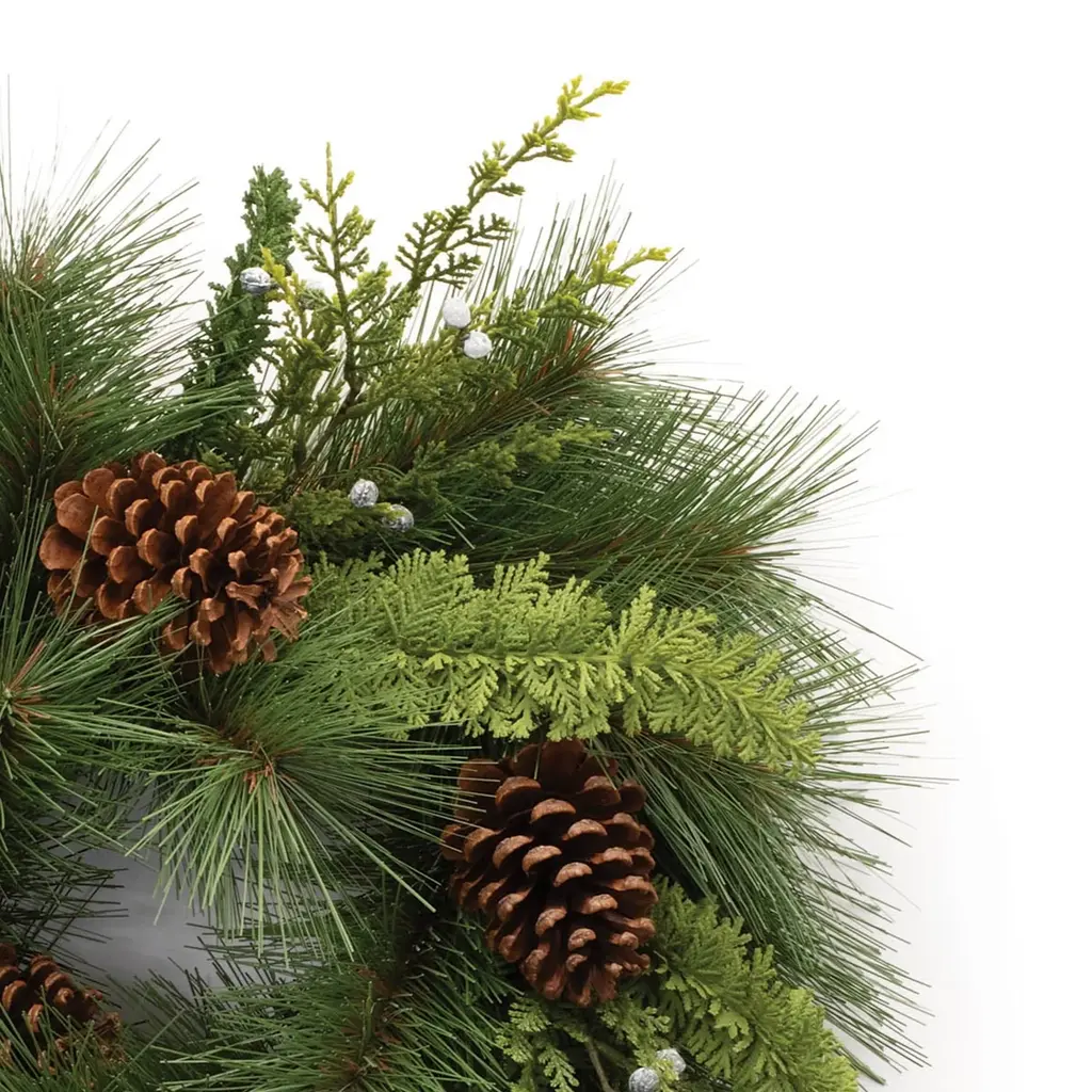 Enhance your holiday décor with the Mixed Pine Cedar Wreath, a classic blend of rustic charm and natural elegance. Measuring 18 inches in diameter, this wreath features lush pine foliage, cedar branch accents, and natural pinecones and twigs, all in earthy green and brown tones for a timeless look. Wired branches offer versatile styling and dimensional displays, making it easy to incorporate into your seasonal setup. Perfect for front doors, fireplace mantels, or wall décor, this wreath adds a touch of nature-inspired beauty to your holiday home.