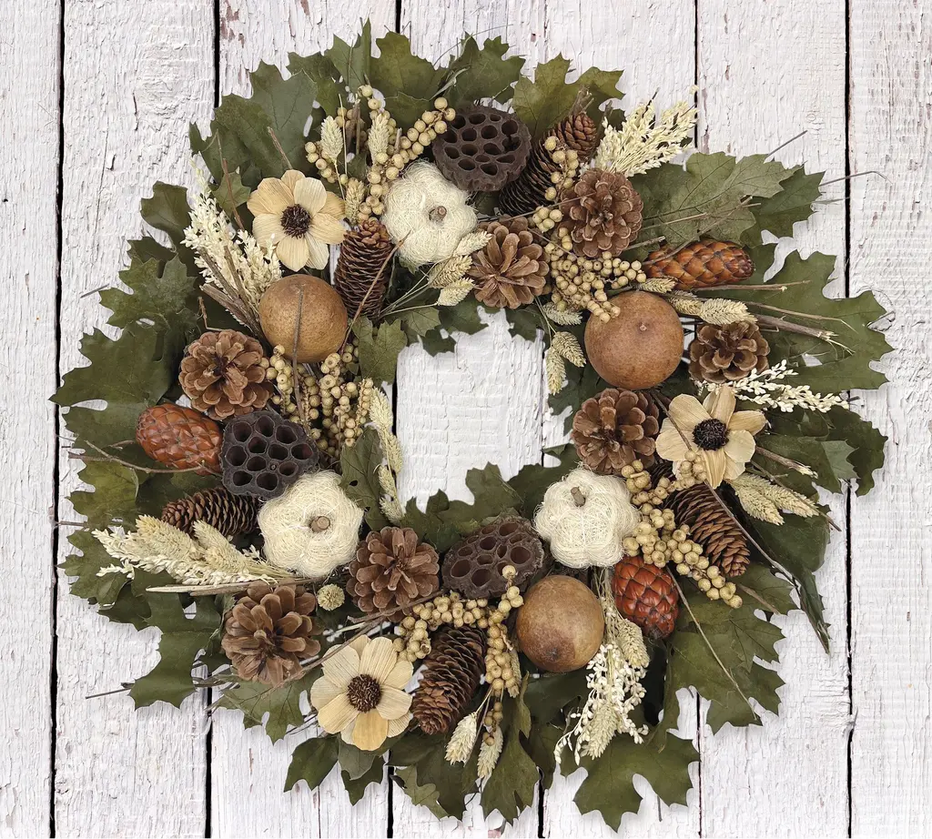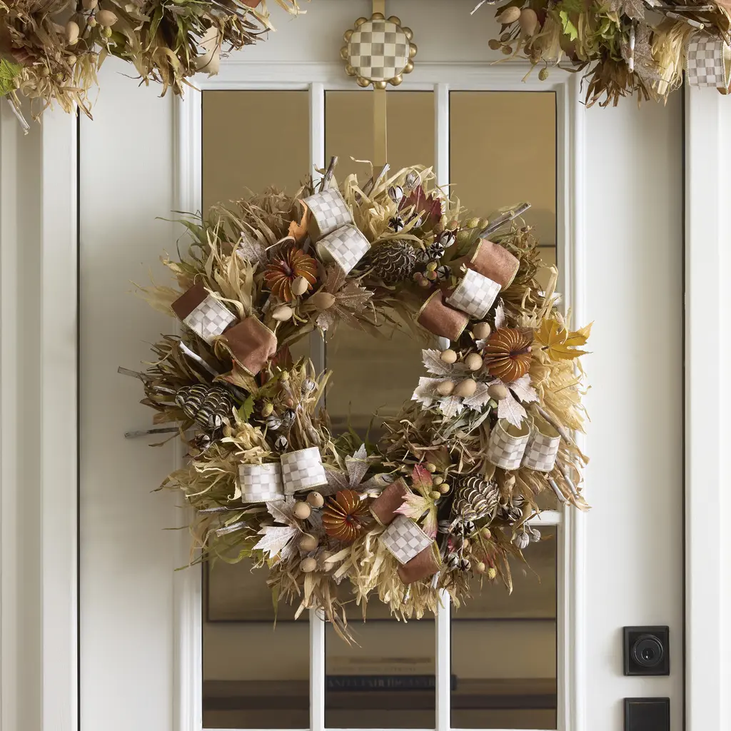 Make your home feel warm and welcoming for the season. Our Mocha Check Harvest Wreath has an abundance of autumn accents, including seed pods, tiny orange pumpkins, and corn husks, all accented with our Mocha Check ribbons.