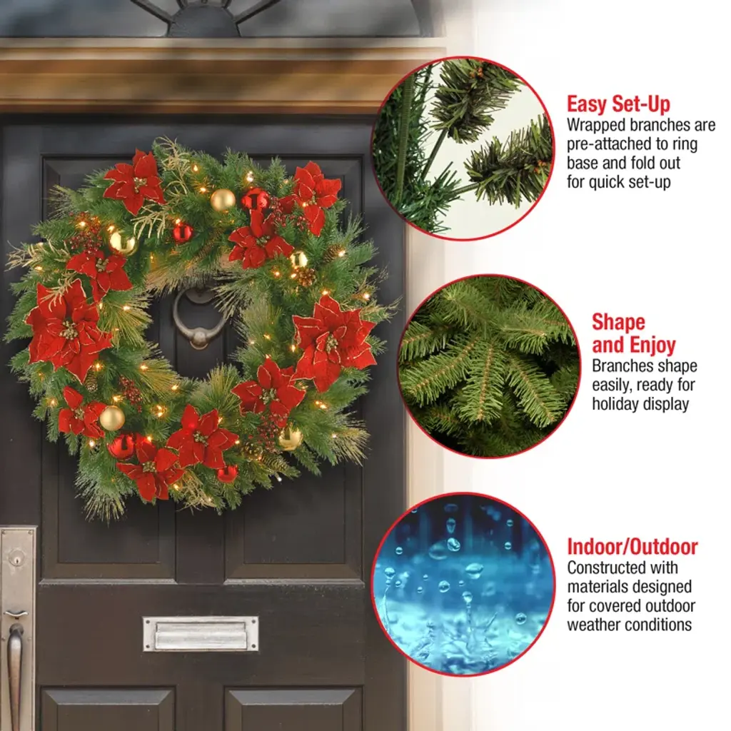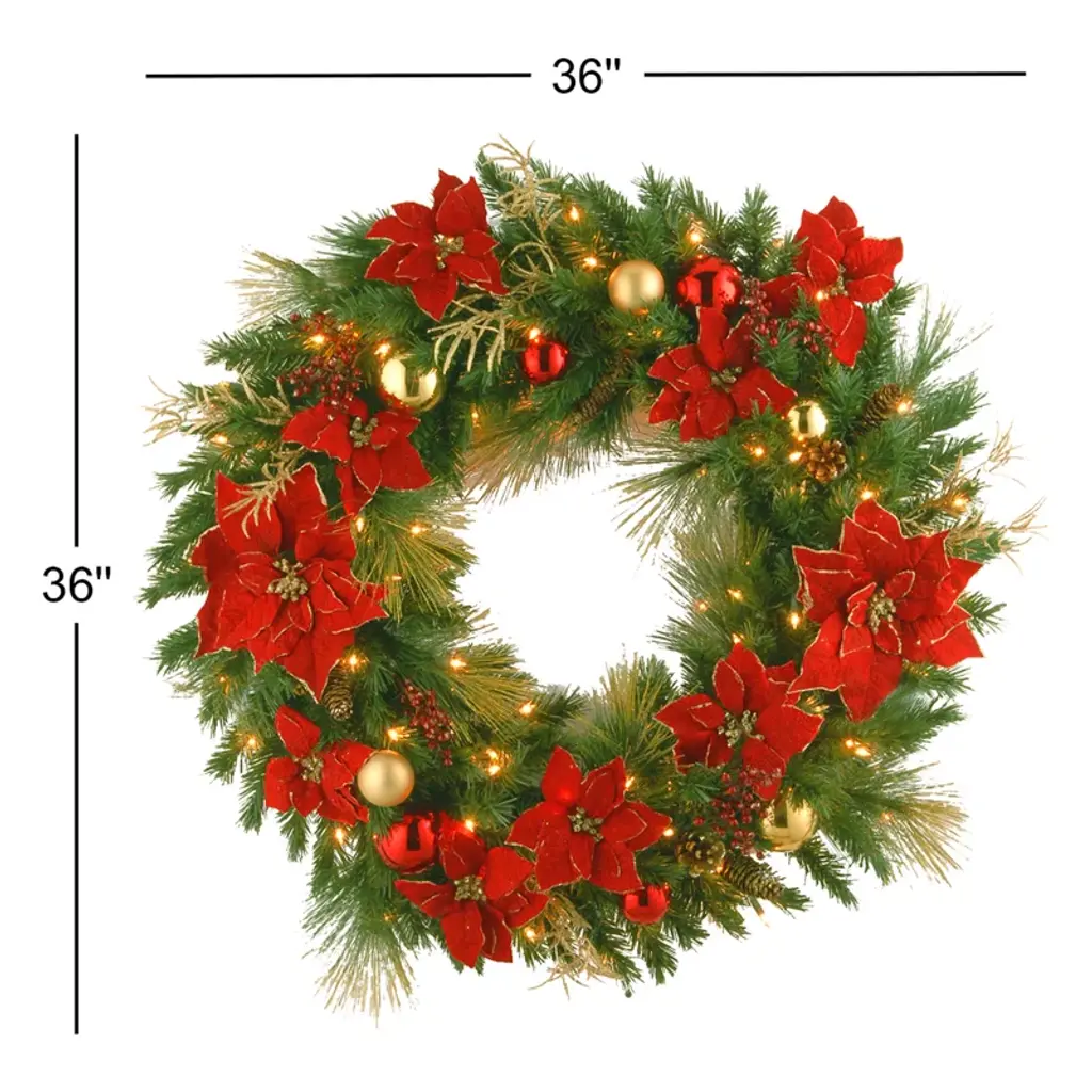 Welcome the holiday season with this delightful 36" lighted wreath, adding a festive touch to your indoor or covered outdoor spaces. This pre-lit wreath is handcrafted from PVC and adorned with twinkling incandescent lights for that warm, Christmas glow. The bendable stems and fused stems make it easy to shape and style to your liking. Just remember to store it in a cool, dry place away from sunlight when not in use. Happy holidays!