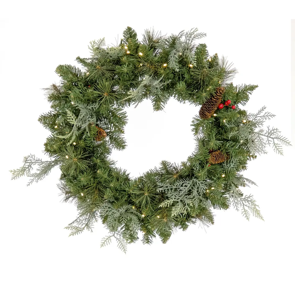 The Feel Real® Buzzard Pine Assortment is a gorgeous, holiday staple for your home. Features Feel Real® branch tip technology, creating a tree with remarkable realism. These crush-resistant branch tips are molded from real tree branches for an authentic living tree appearance. This assortment includes 3 pieces of festive greenery that will make decorating easy, yet beautiful. The five foot entrance tree is seated in a pot with 70 warm white LED lights. Also includes is a 24" wreath and a six foot garland with 100 warm white battery operated LED lights. Pre-decorated with pine cones and red berries, this delightful assortment is perfect to add to any entryway, fireplace mantel, or stairway. Create new memories with this charming collection.