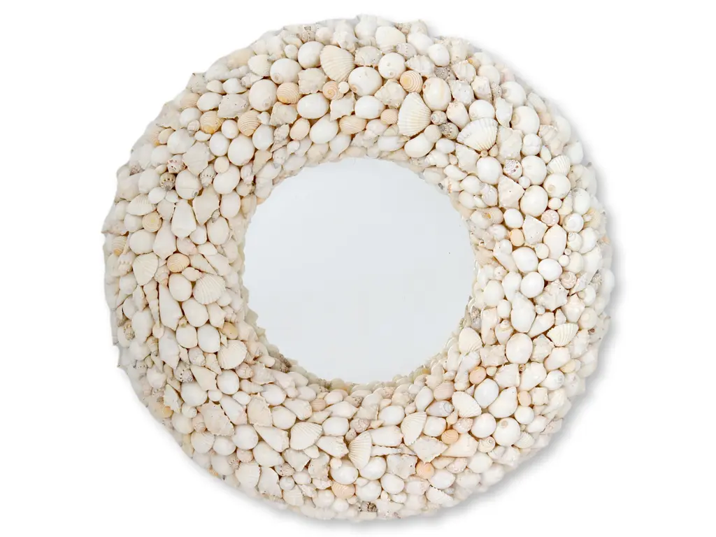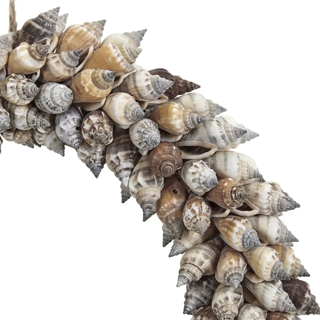 Natural shell wreath made of hundreds of "brown chula" shells that are varying shades of tan, brown, yellow, grey and white. Chunky and strong, these shells are wired together for a long-lasting wreath. Use it all year round, and add a colored bow to represent festive times! Comes in three sizes: 6", 8" and 10" diameter. Great for doors, walls and even a centerpiece ring for a vase or candle!