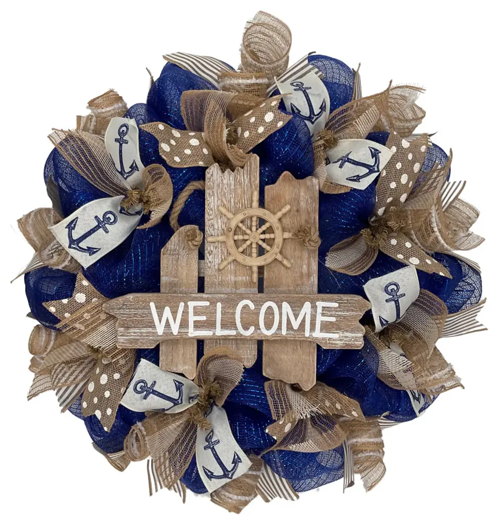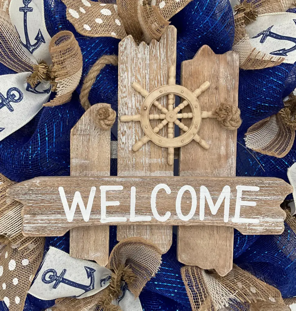 New, Full, Premium, large, handmade deco mesh nautical wreath. A captains wheel is placed on a weathered driftwood and is decorated with the word "œWelcome."� Nautical rope is added. The accent rests on royal blue deco mesh. Beautiful, premium anchor ribbons and natural burlap and ivory mesh ribbons are placed along the inner ring along with burlap and white dot ribbons. The outer ring is made of beautiful natural canvas ribbons with white stripes and natural white striped mesh flutes. The wreath measures 24 inches in diameter and 6 inches deep. Perfect for lake, beach and summer homes.