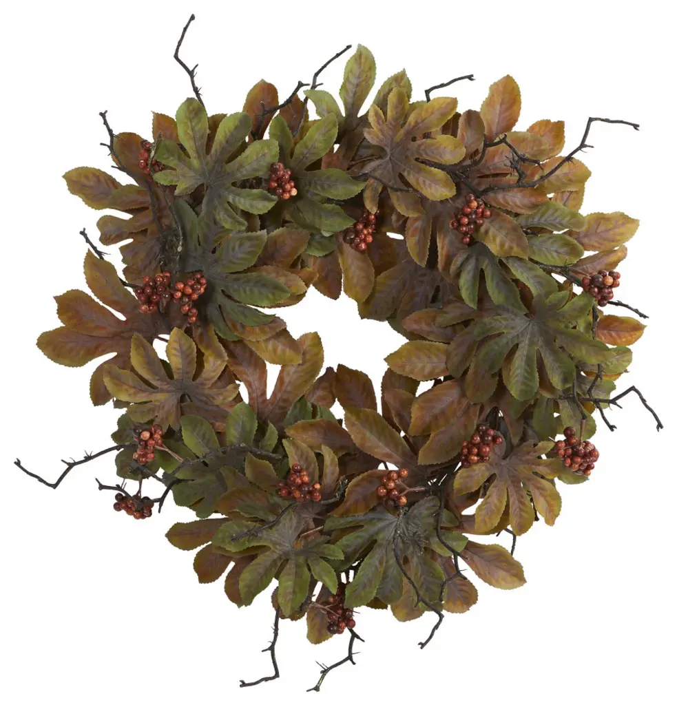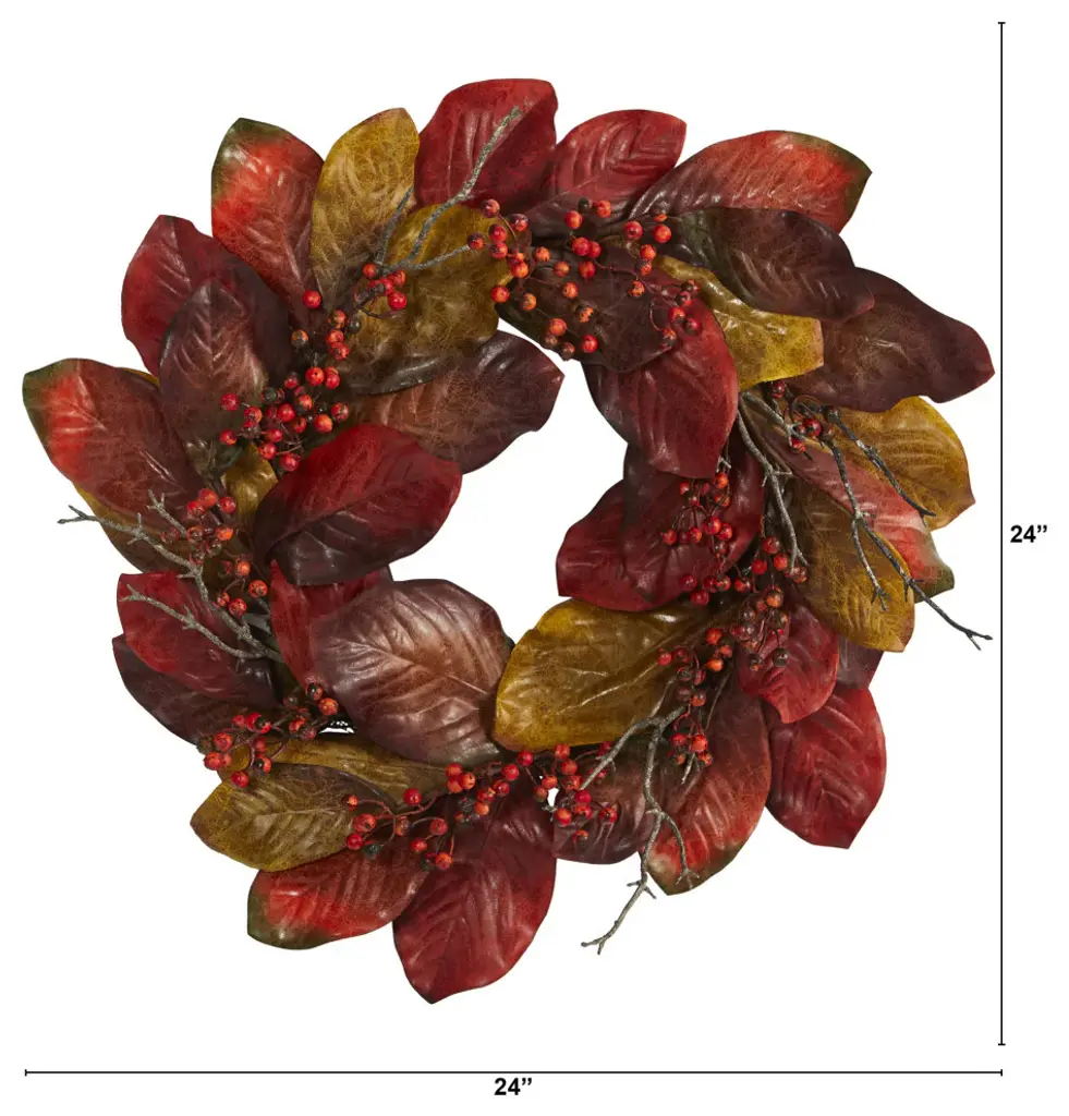 Showcase hues of the harvest with the autumn-inspired beauty provided by this colorful artificial wreath. Intricately designed with realistic looking magnolia leaves in fiery, seasonal colors, it comes complemented with sprays of faux berries that look incredibly lifelike. Perfect for sprucing up a bare wall or an empty doorway, this 24" (in circumference) decorative wreath would undoubtedly make a handsome holiday accent wherever displayed.