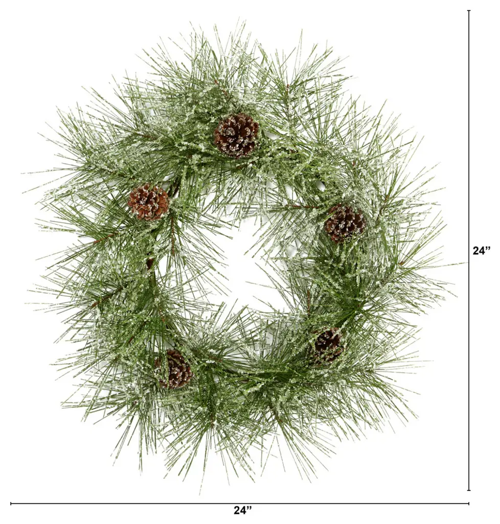 Keep winter-inspired decor accents traditional this year with the help of this iced artificial wreath. Intricately designed from realistic looking pine foliage in a palette of soft evergreens, this decorative wreath comes carefully accented with realistic looking fake pinecones - and frosted with a hint of faux snow to help get you into the holiday spirit. Perfect for wall and/or door display in either a home or office environment, this frosted 24� (in circumference) decorative wreath makes for an inviting accent and can undoubtedly help inject front-door appeal all throughout the season.